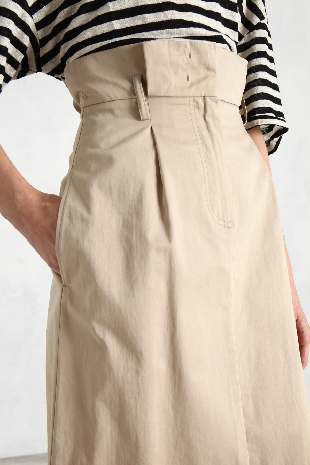 Gonna dalla linea svasata realizzata in rasetto di puro cotone, con pieghe in vita, tasche laterali inserite in cucitura e allacciatura nascosta tramite zip, bottone e ganci. Cintura coordinata con fibbia metallica.
