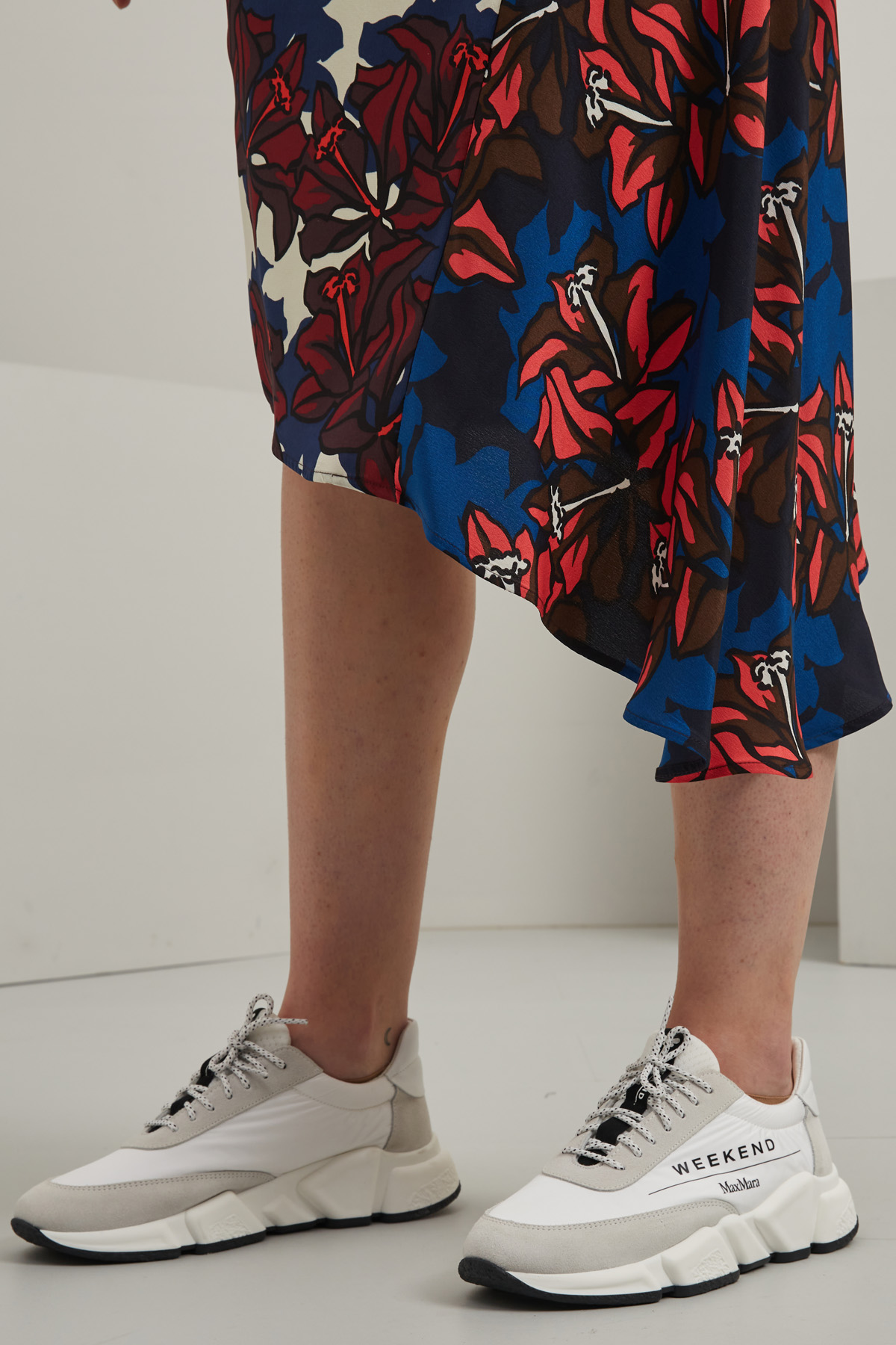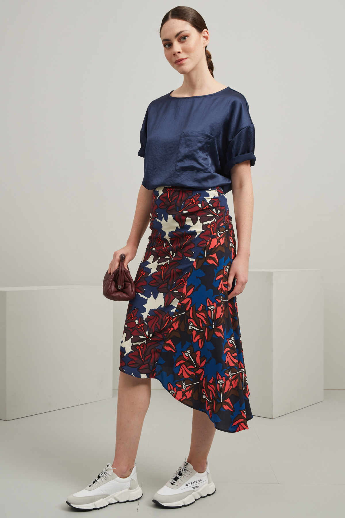 Gonna dalla linea asimmetrica realizzata in crépe de chine di pura seta stampata con motivo arricciato e allacciatura tramite zip invisibile sul fianco. Foderata.