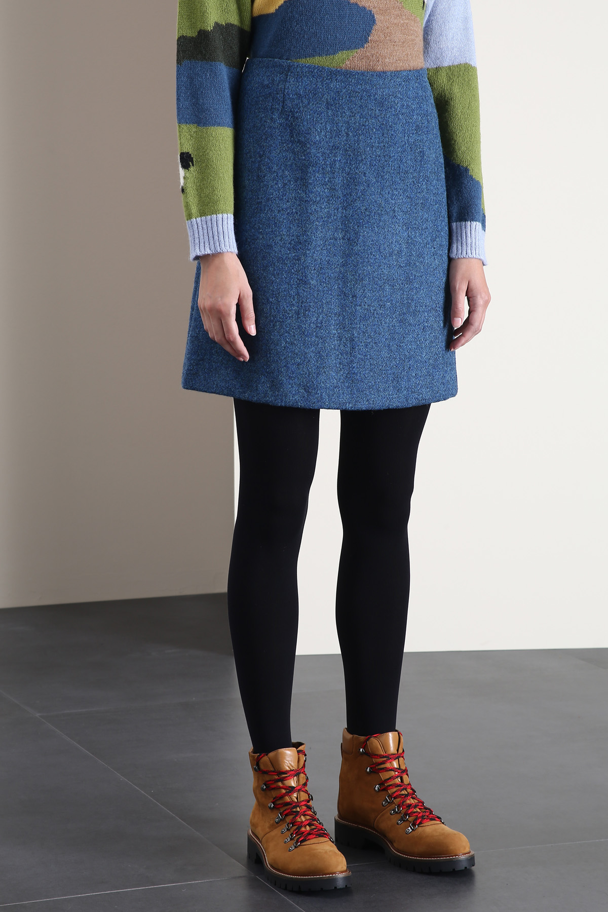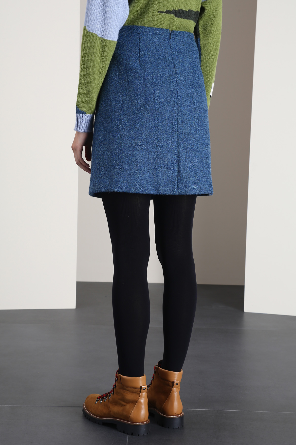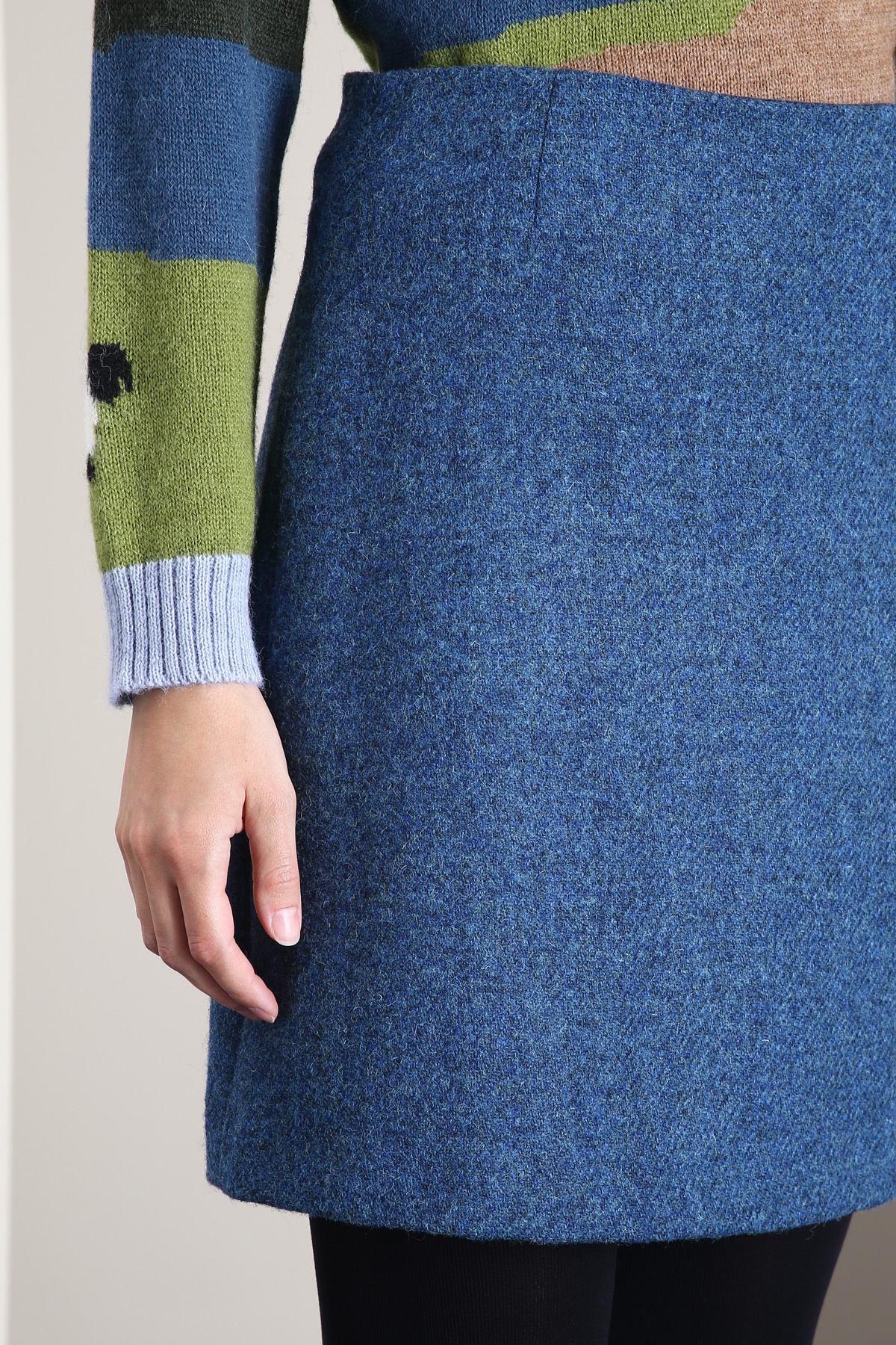 Minigonna dalla linea ad A realizzata in tessuto di pura lana, con allacciatura tramite zip invisibile sul retro. Capo foderato.