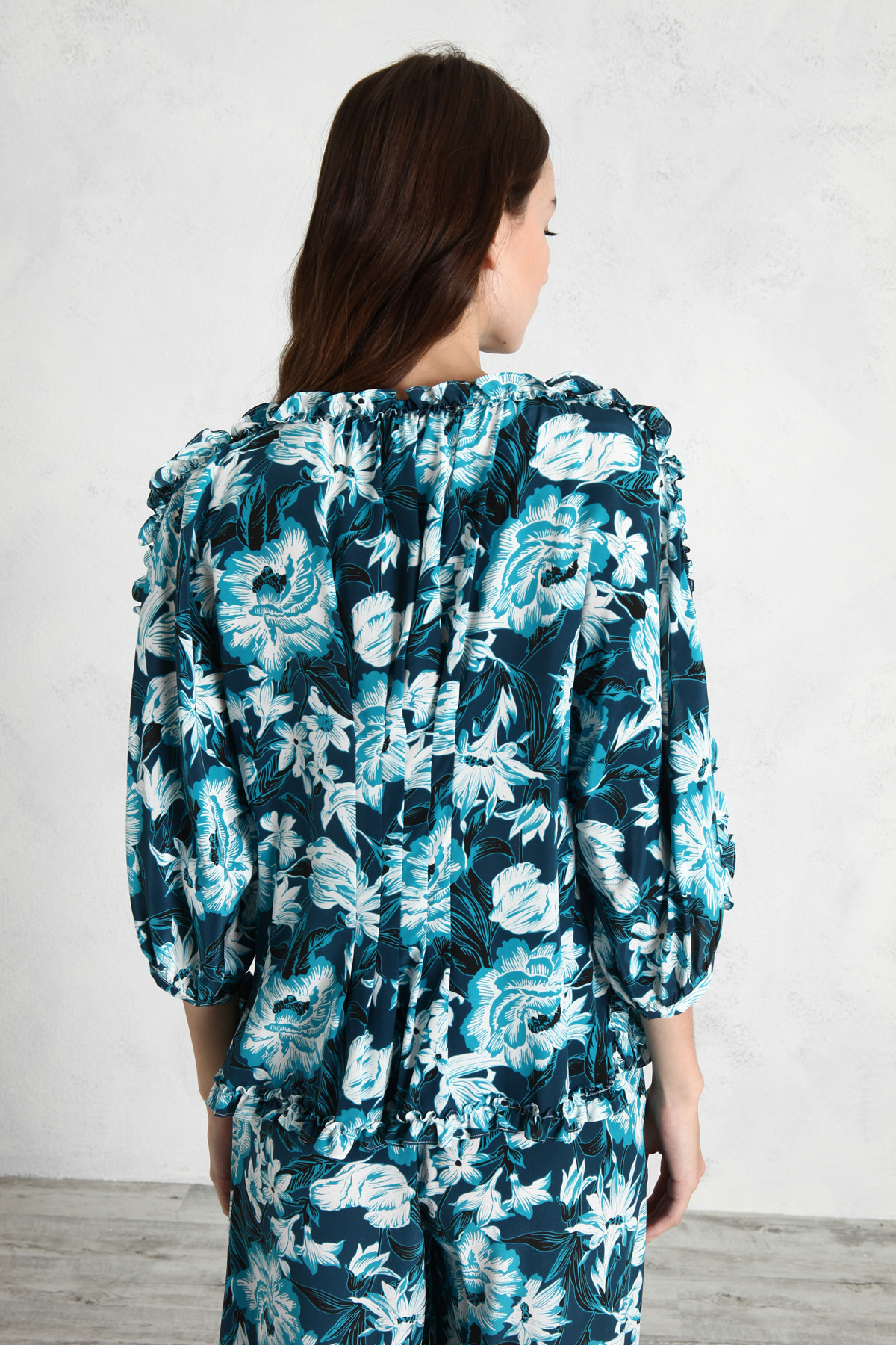 Blusa dalla linea fluida realizzata in crêpe di pura seta stampata, con scollo a barchetta, maniche tre quarti a kimono con dettaglio di apertura, motivo di pieghe in vita e ruches sui bordi.