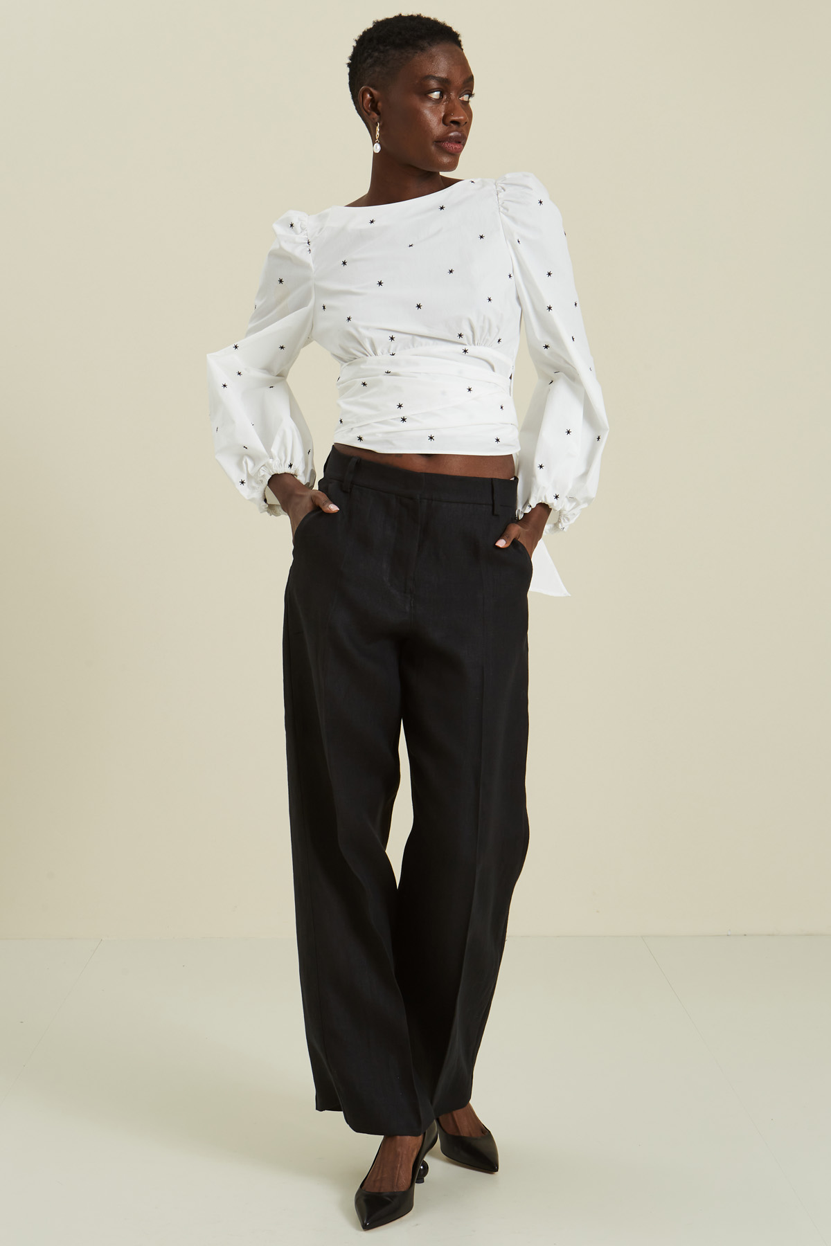 Casacca dalla linea semiaderente realizzata in popeline di cotone, con ricamo allover, scollo a barchetta davanti e a V incrociato dietro, maniche a sbuffo e allacciatura con fusciacca da annodare in vita.