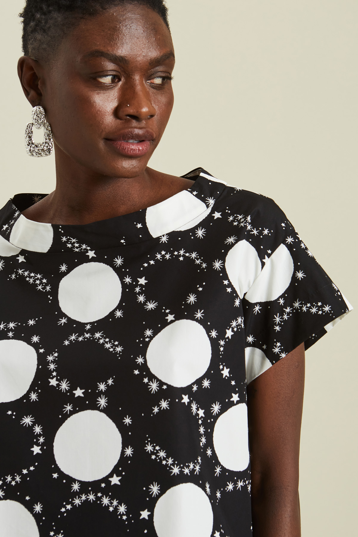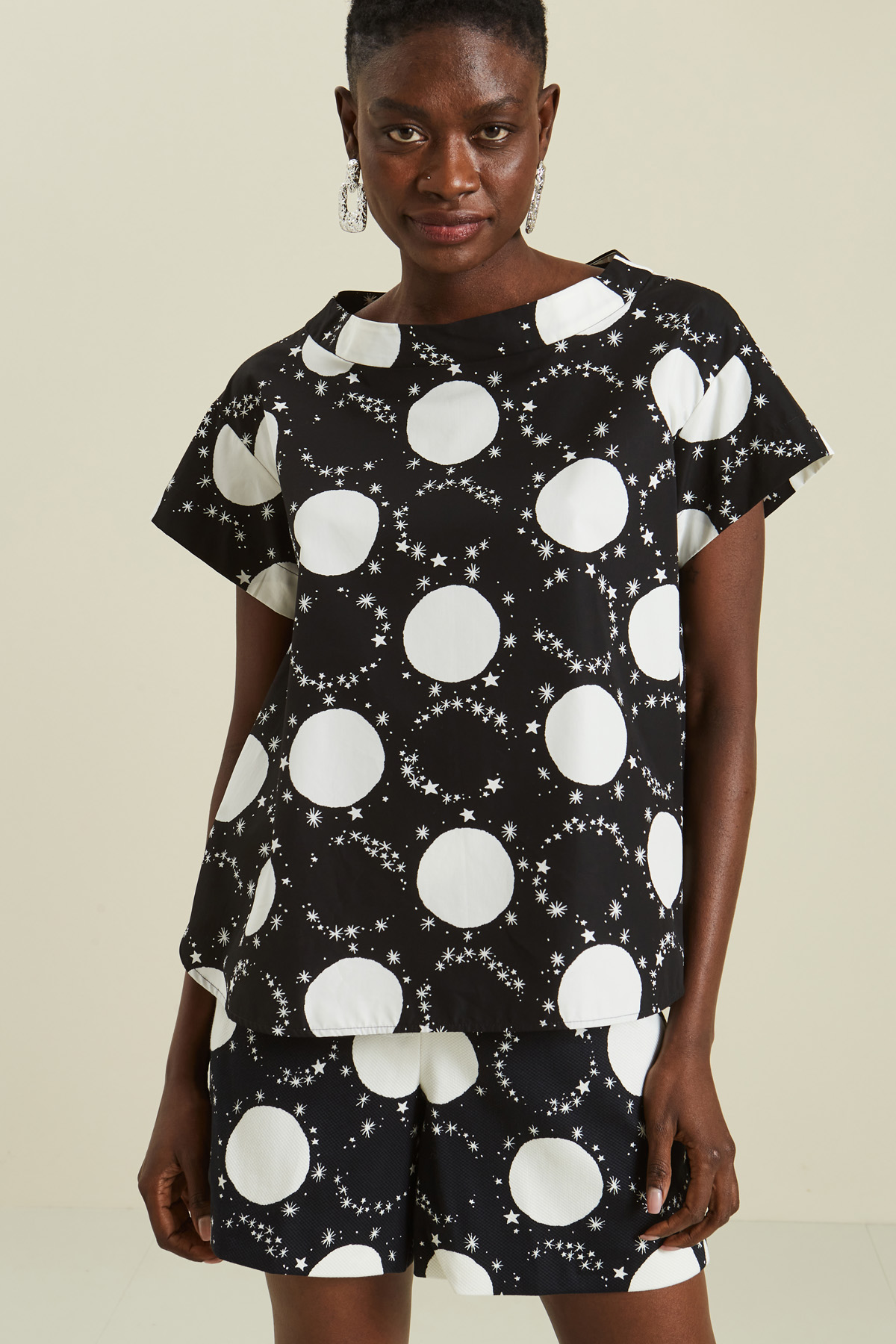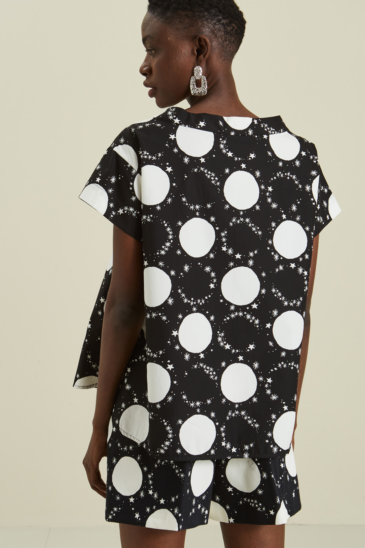 Casacca dalla linea boxy realizzata in popeline di puro cotone, con collo a cratere, maniche corte dal giro sceso e orlo asimmetrico leggermente più lungo dietro.