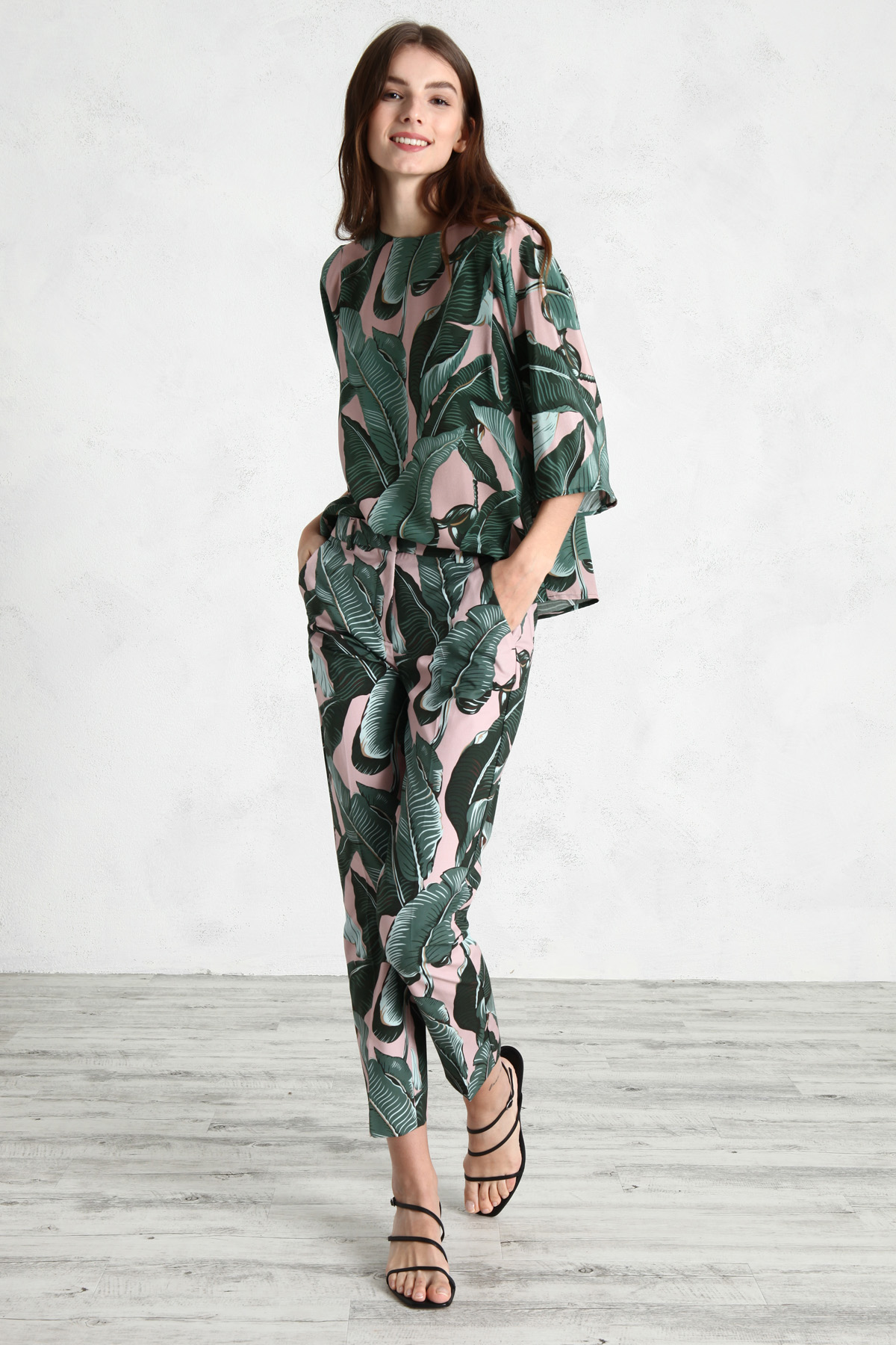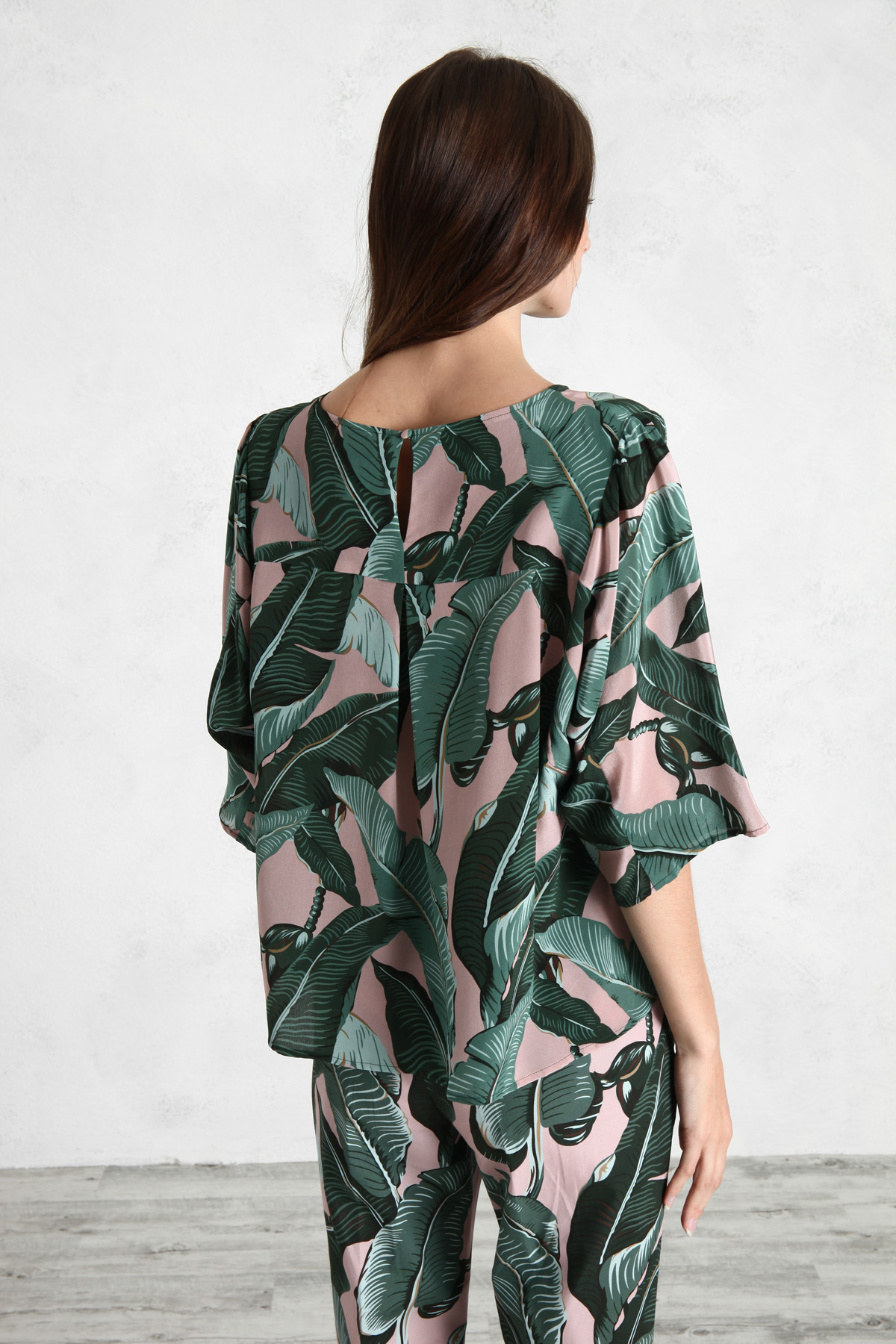 Blusa dalla linea morbida realizzata in crêpe di pura seta stampata, con scollo rotondo, maniche tre quarti a kimono, taglio carrè con contropiega e allacciatura a goccia con bottone dietro.