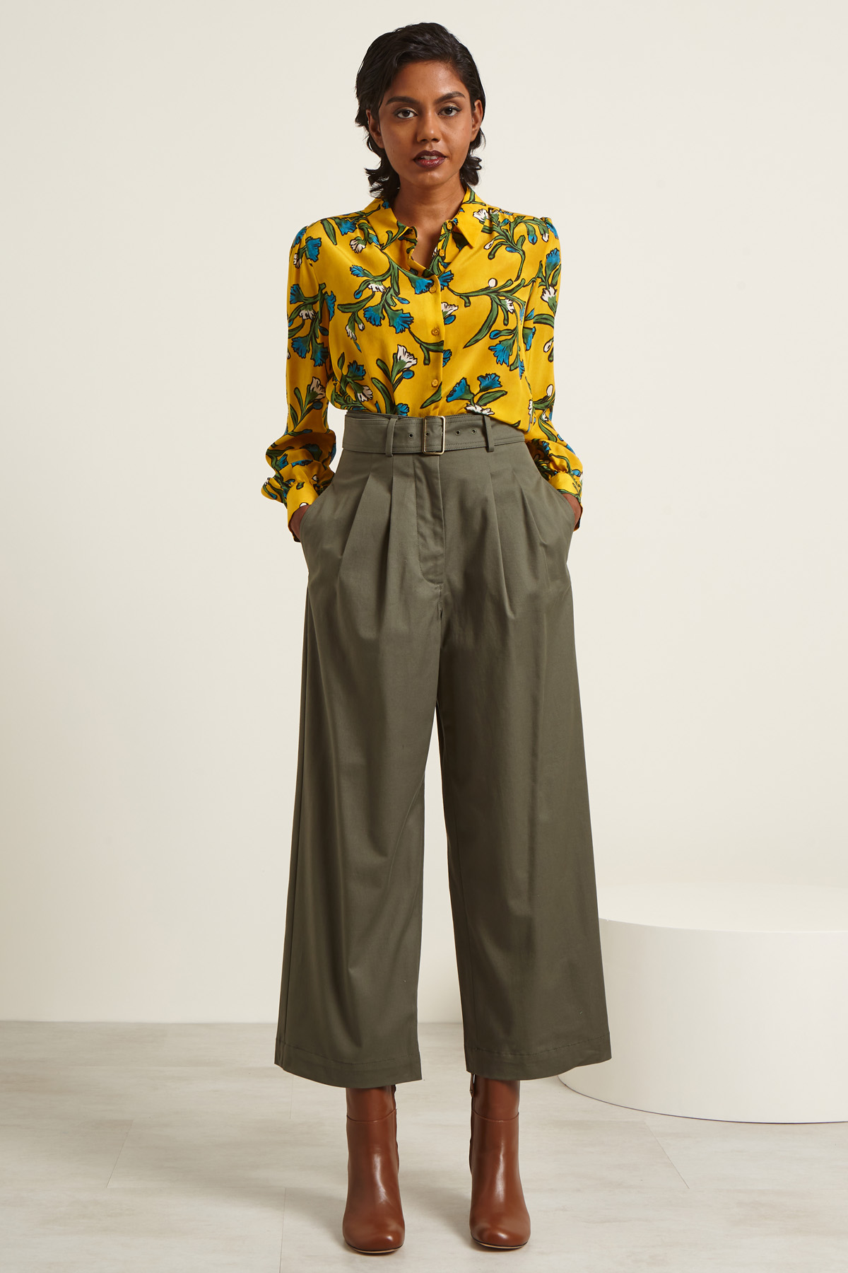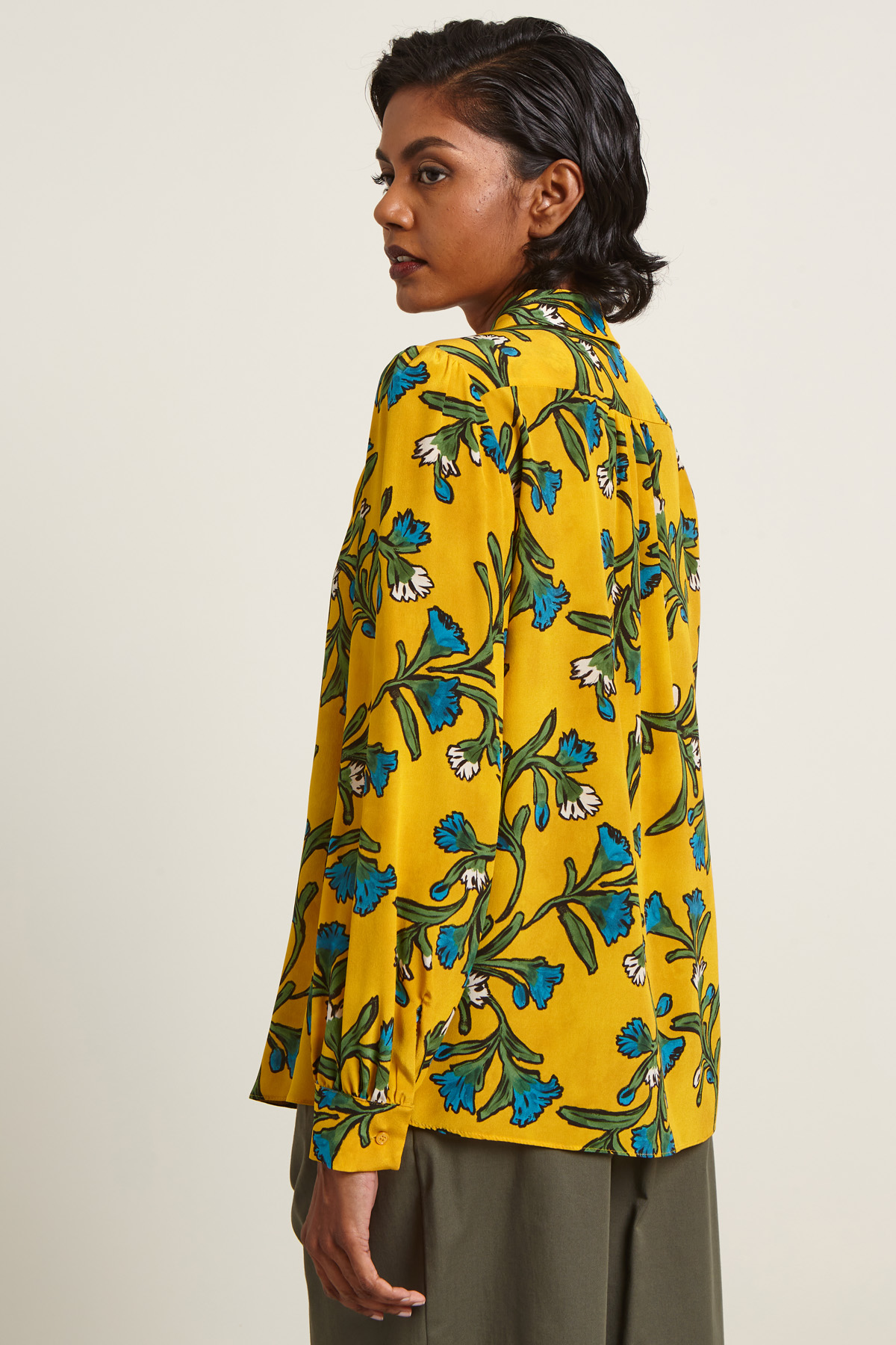 Camicia dalla linea fluida realizzata in crêpe de chine di pura seta, con colletto classico, maniche lunghe a palloncino con polsino e bottone, carrè e cannoncino nel retro. Allacciatura tramite bottoni a vista.