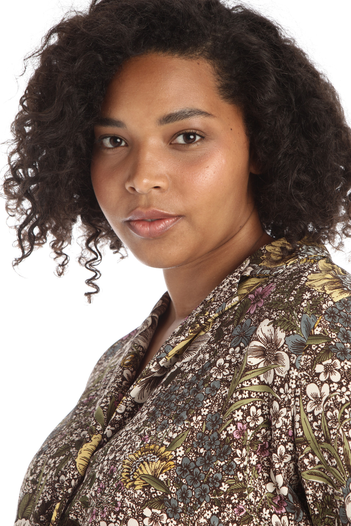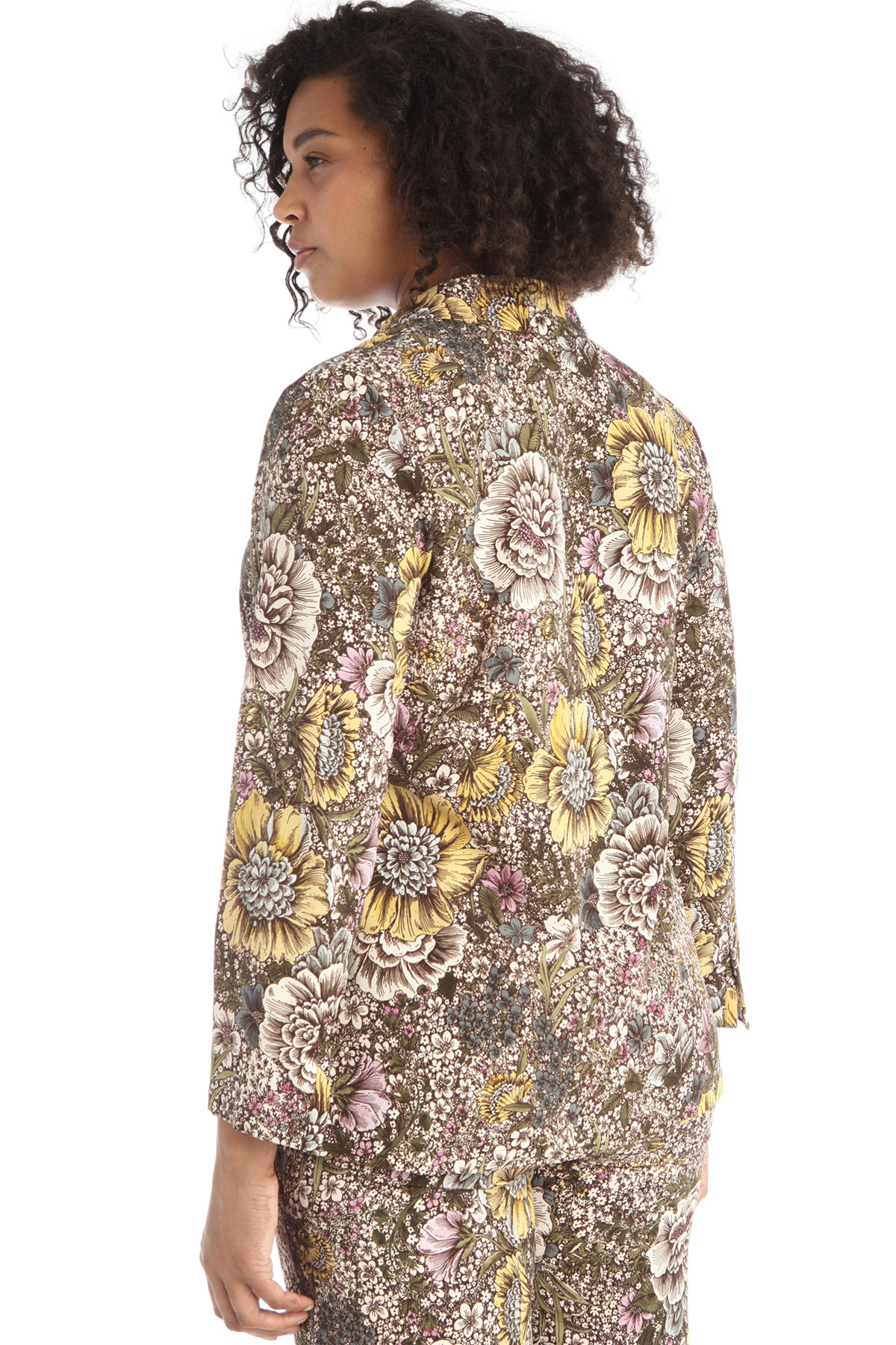 Casacca dalla linea diritta realizzata in crepé fluido stampato, collo a rever, maniche lunghe con spacchetto, tasche applicate, spacchi laterali al fondo e allacciatura tramite bottoni a vista.