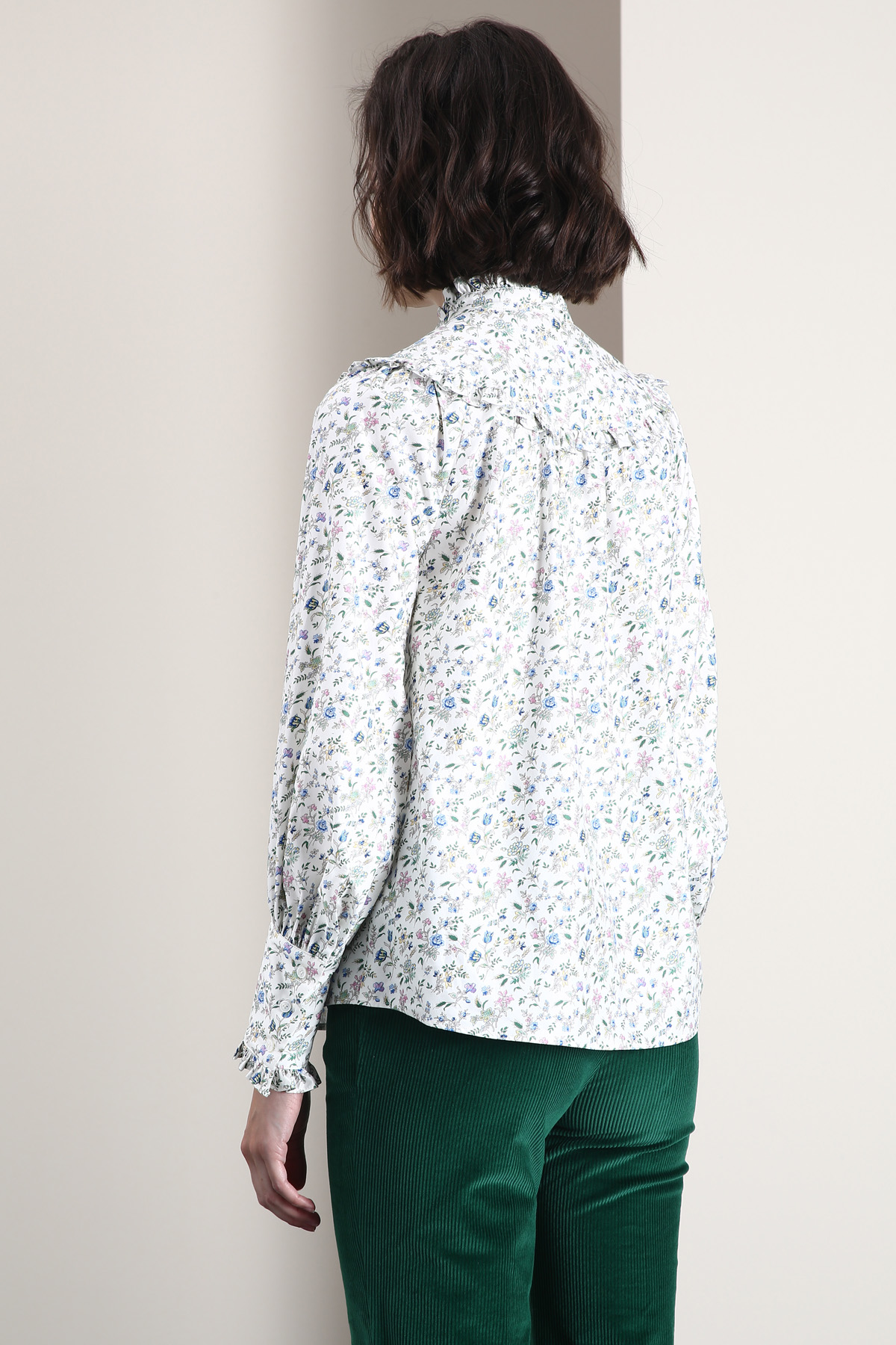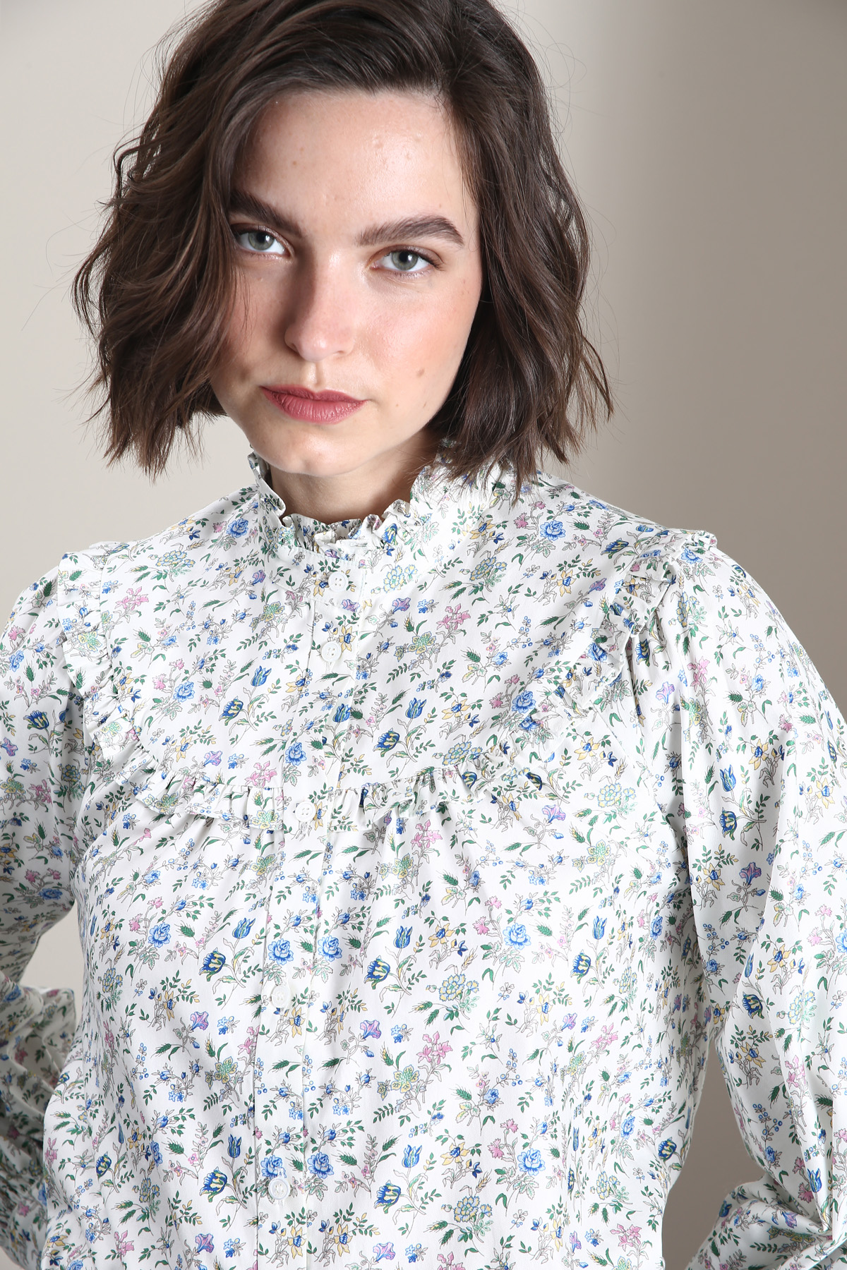 Camicia dalla linea dritta realizzata in twill di puro cotone stampato, con collo alla coreana, taglio carrè stondato rifinito da ruches, maniche a sbuffo con polsino alto e bottoni e allacciatura tramite bottoni a vista.