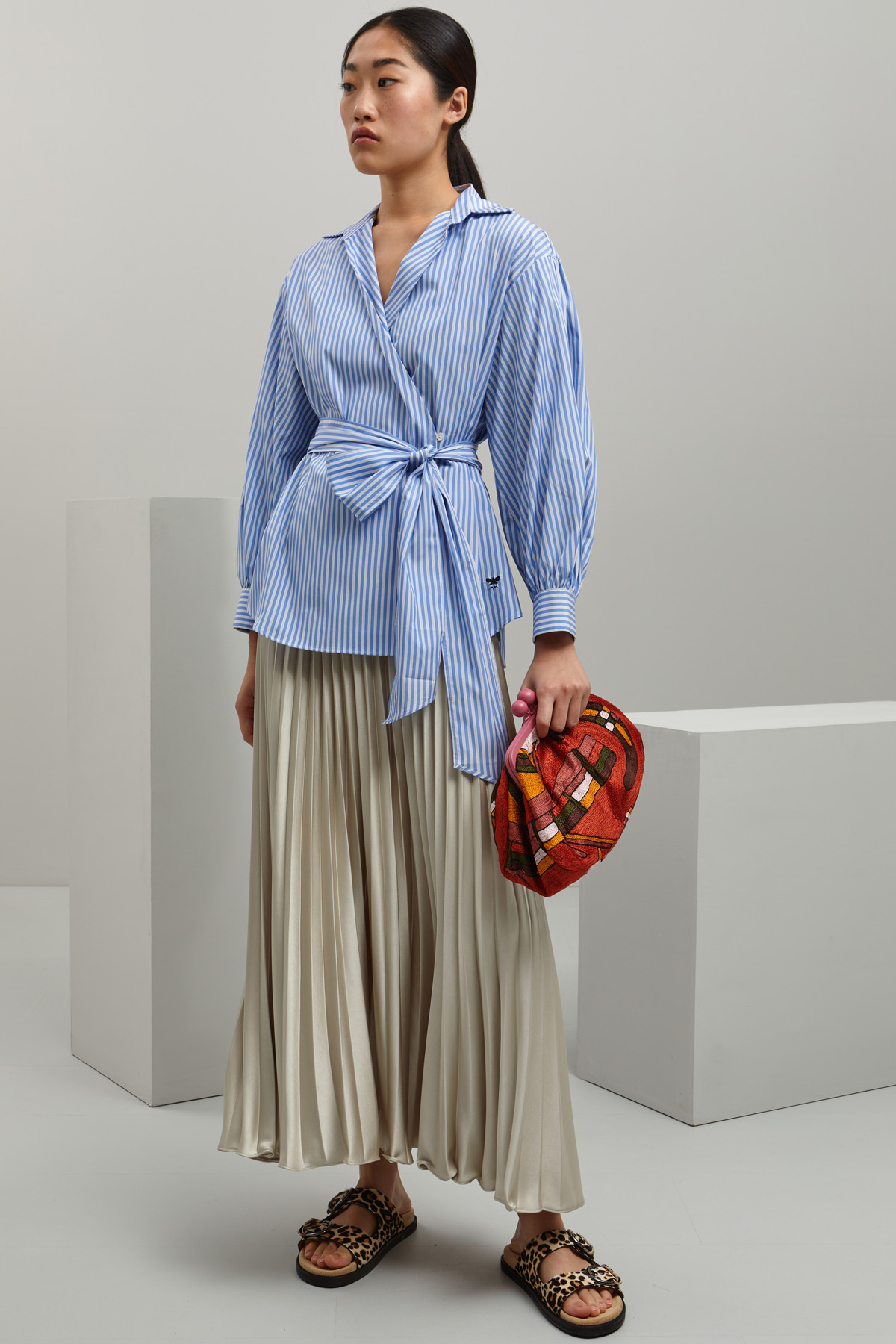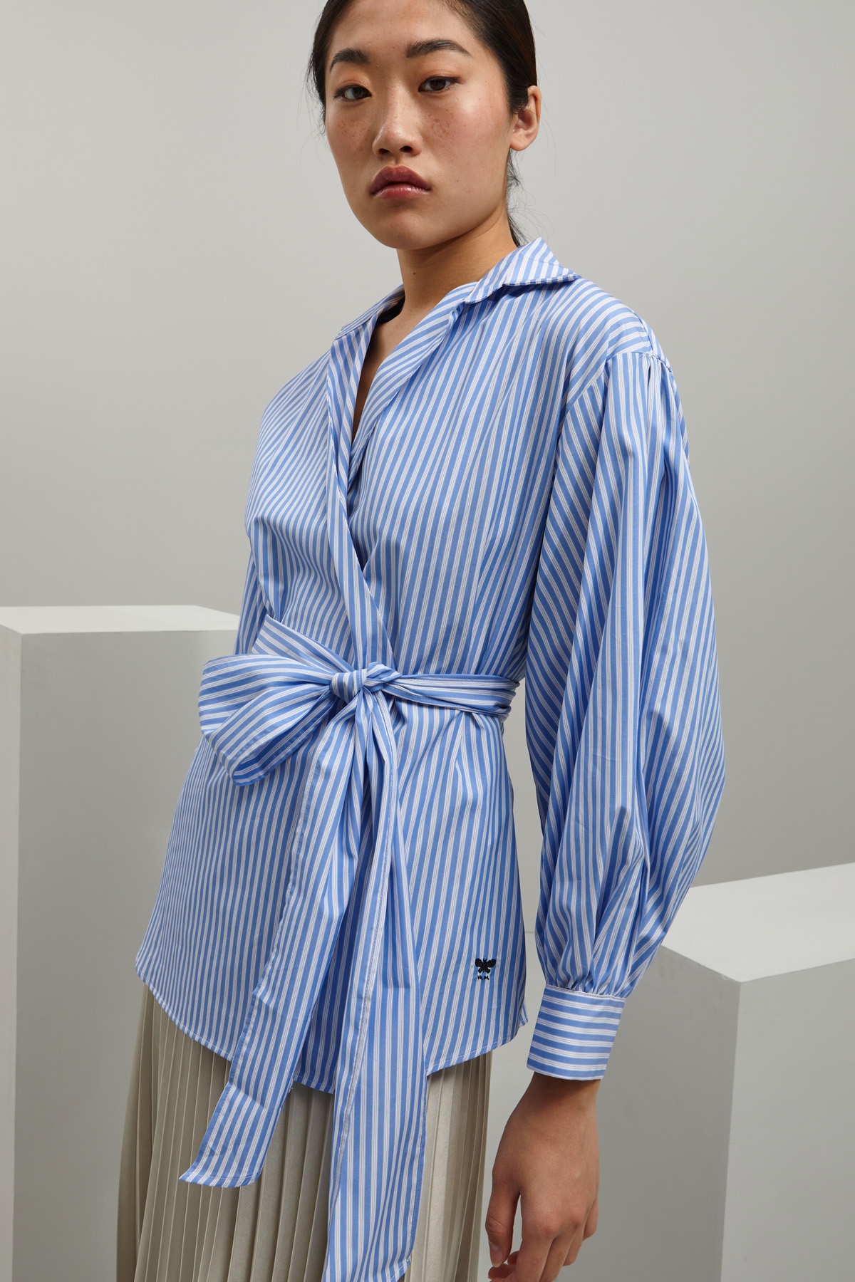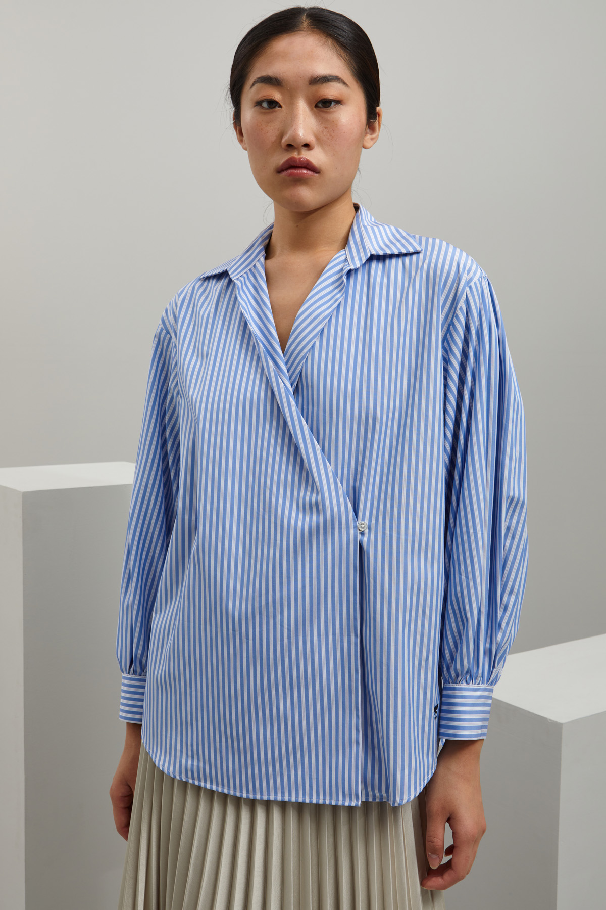 Camicia dalla linea asimmetrica realizzata in popeline di puro cotone, con colletto classico, maniche lunghe a palloncino e polsini con bottone. Carrè e cannoncino nel retro, allacciatura tramite bottone. Capo dotato di fusciacca in abbinamento.