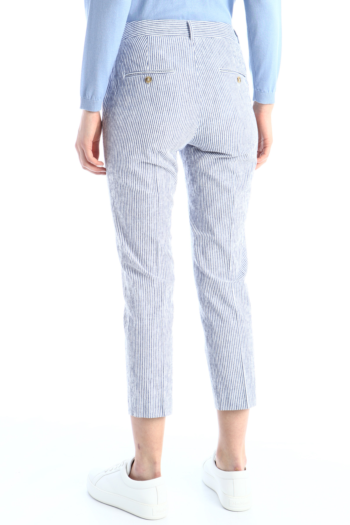 Pantaloni cropped a sigaretta realizzati in seersucker di cotone e lino tinto in filo, con tasche alla francese sui fianchi e a filetto con bottone sul retro. Allacciatura nascosta con zip, bottone e gancio.