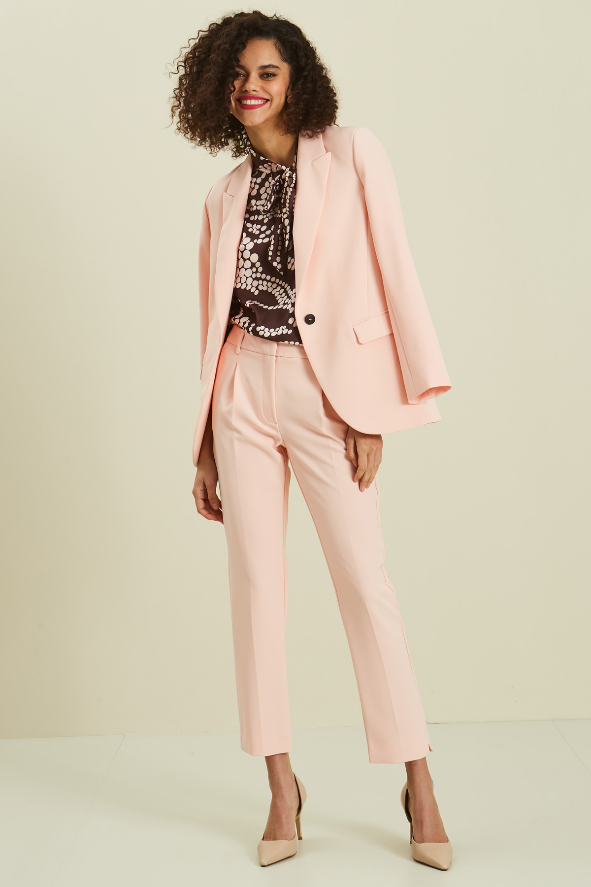 Pantaloni dalla linea dritta realizzati in cady stretch, con passanti in vita, tasche laterali alla francese, spacchetti al fondo e allacciatura nascosta tramite zip, bottone e gancio.