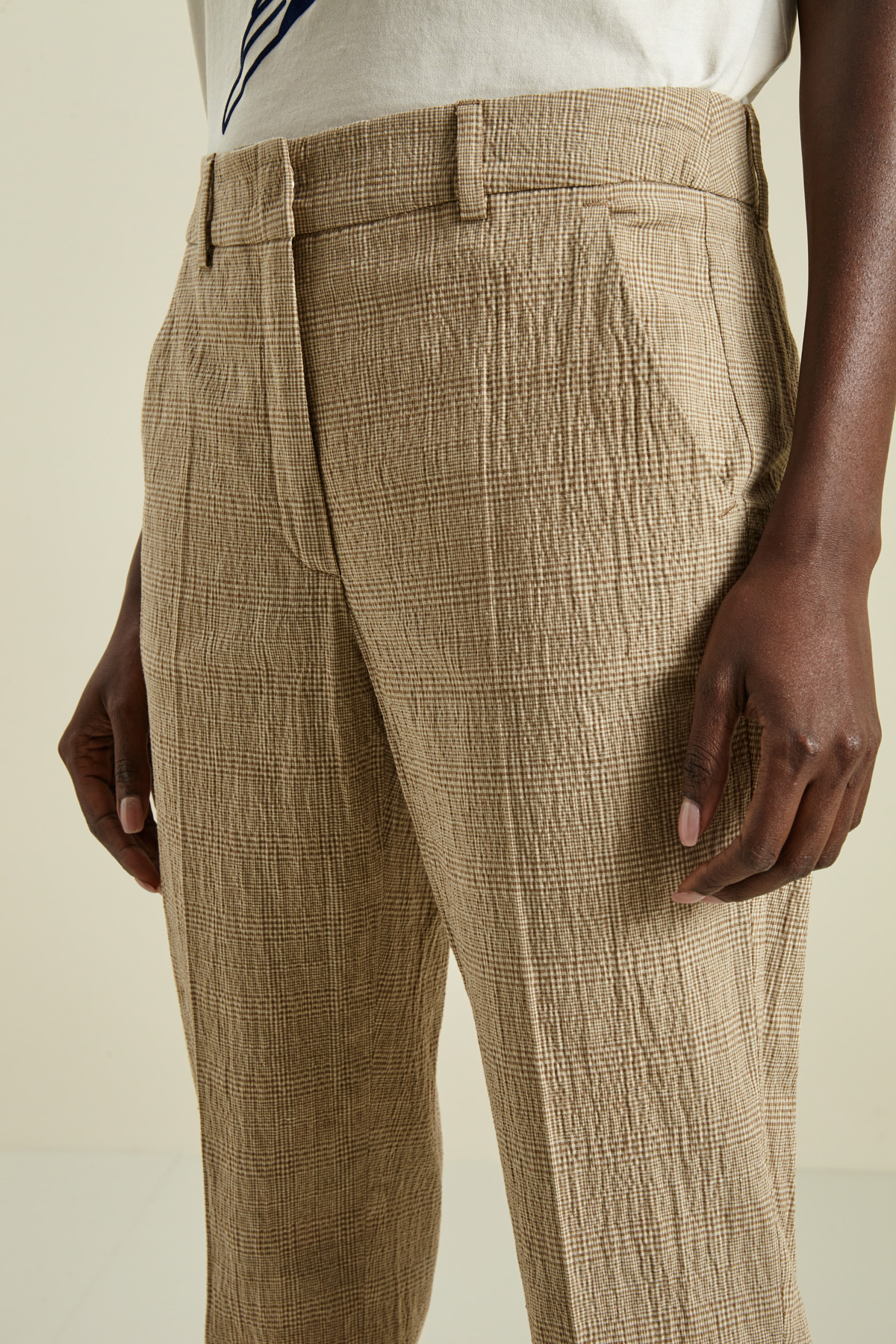 Pantaloni a sigaretta realizzati in tessuto seersucker di cotone e lino stretch, con cintone e passanti in vita, piega stirata, tasche alla francese ai fianchi e a filetto dietro. Chiusura coperta tramite zip, gancio e bottone.