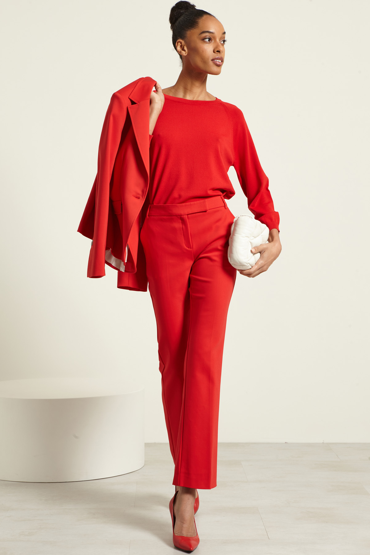 Pantaloni dalla linea dritta realizzati in tela di misto cotone stretch, con passanti in vita, tasche alla francese davanti. Allacciatura nascosta tramite zip, bottone e gancio.