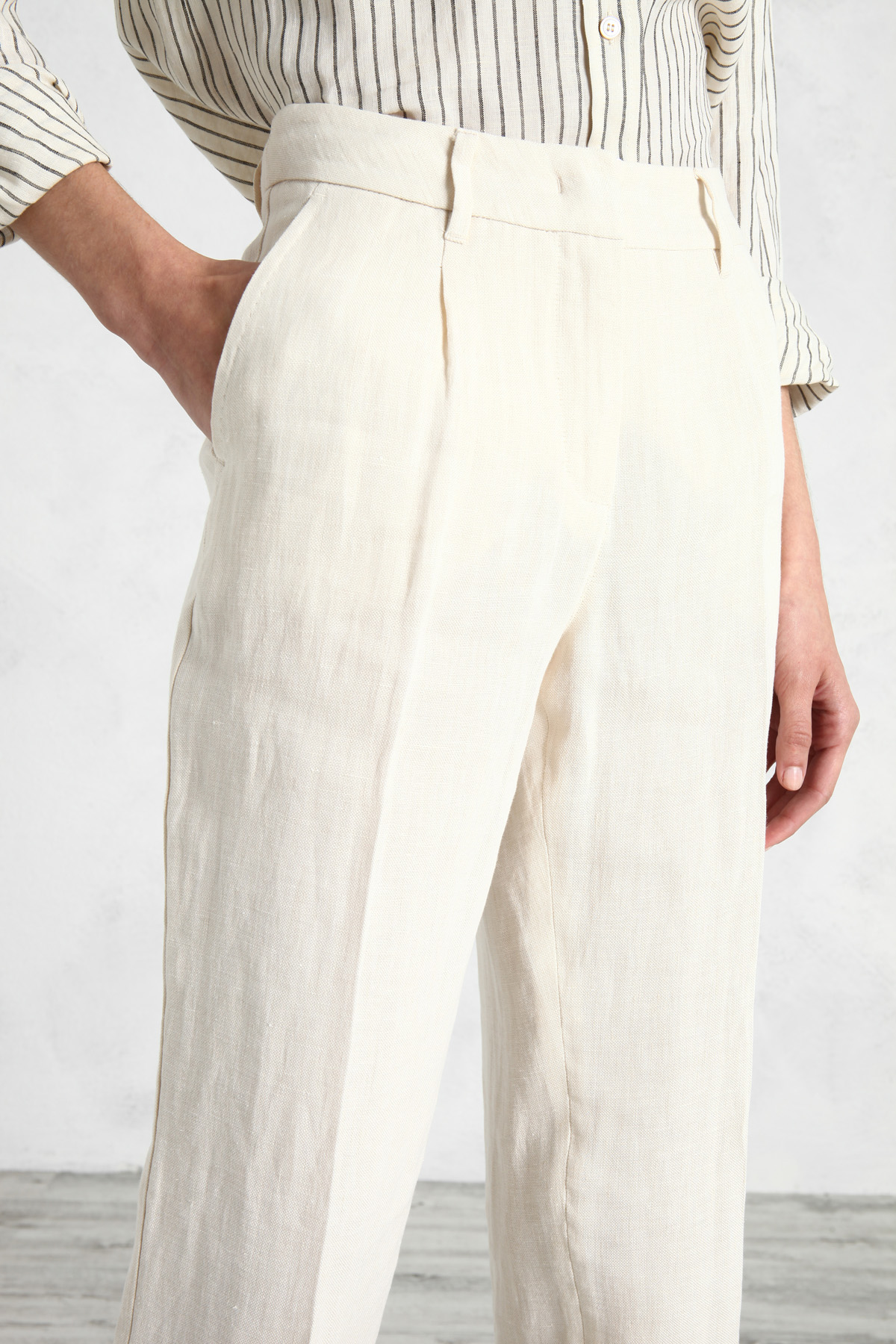 Pantaloni a sigaretta realizzati in canvas di puro lino, con pieghe sul davanti, tasche laterali alla francese e a filetto sul retro. Allacciatura nascosta con zip, bottone e gancio.