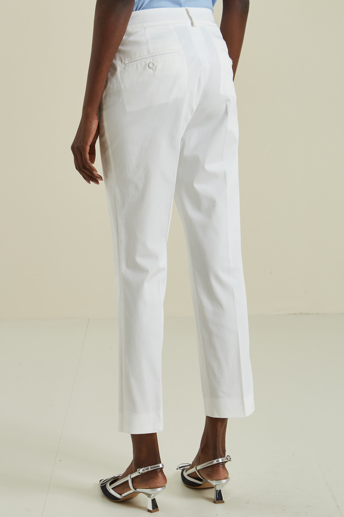 Pantaloni a sigaretta realizzati in gabardina di cotone stretch, con passanti in vita, tasche a doppio filetto con bottone nel retro e allacciatura nascosta tramite zip, bottone e gancio.