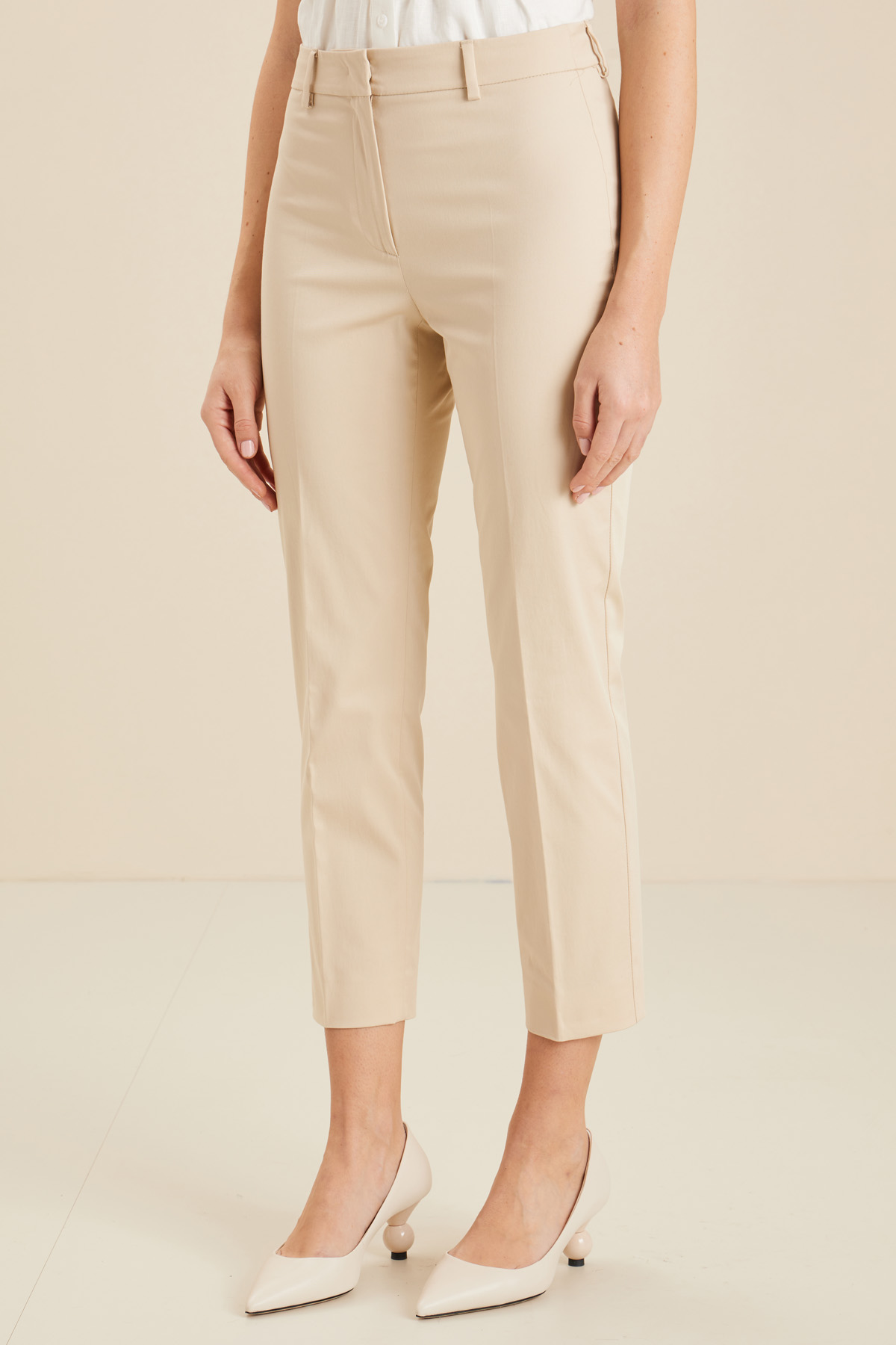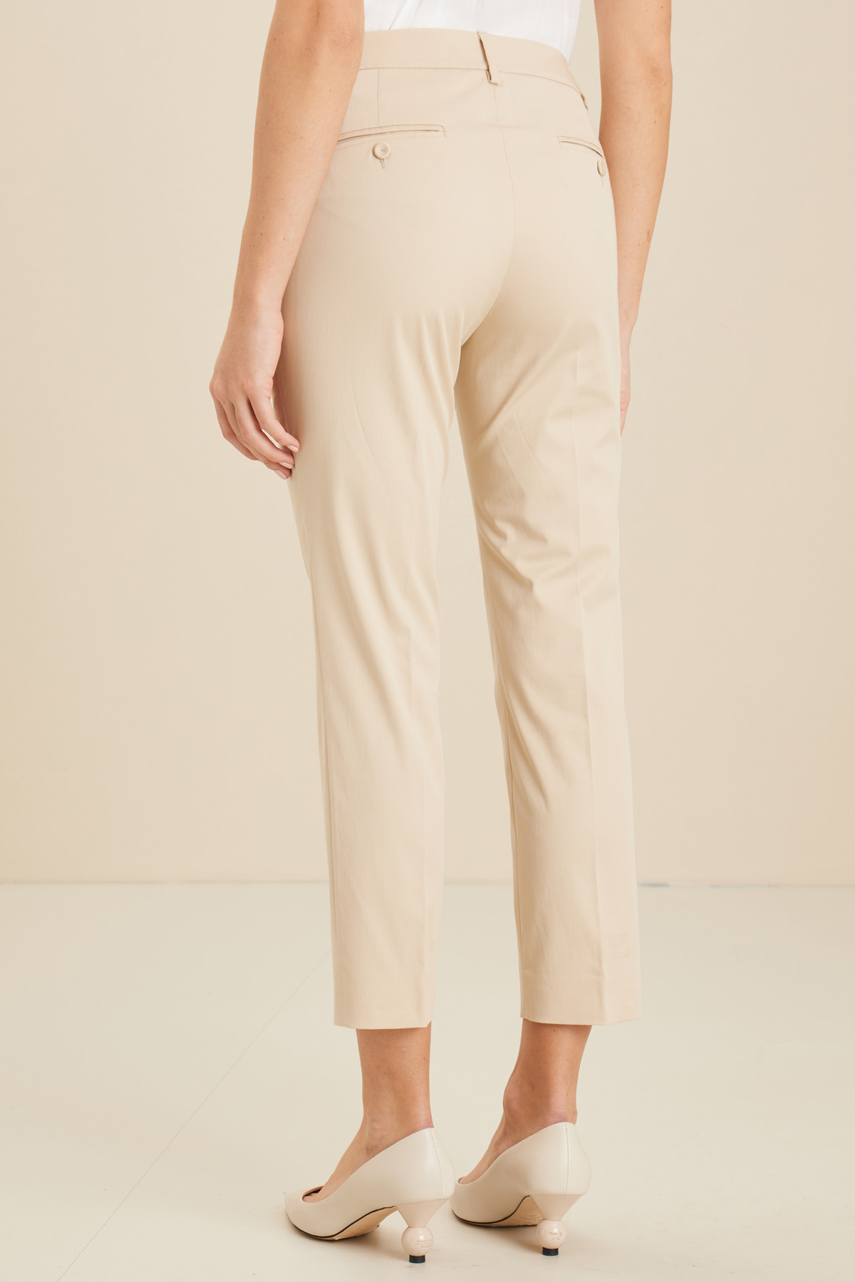 Pantaloni a sigaretta realizzati in gabardina di cotone stretch, con passanti in vita, tasche a doppio filetto con bottone nel retro e allacciatura nascosta tramite zip, bottone e gancio.