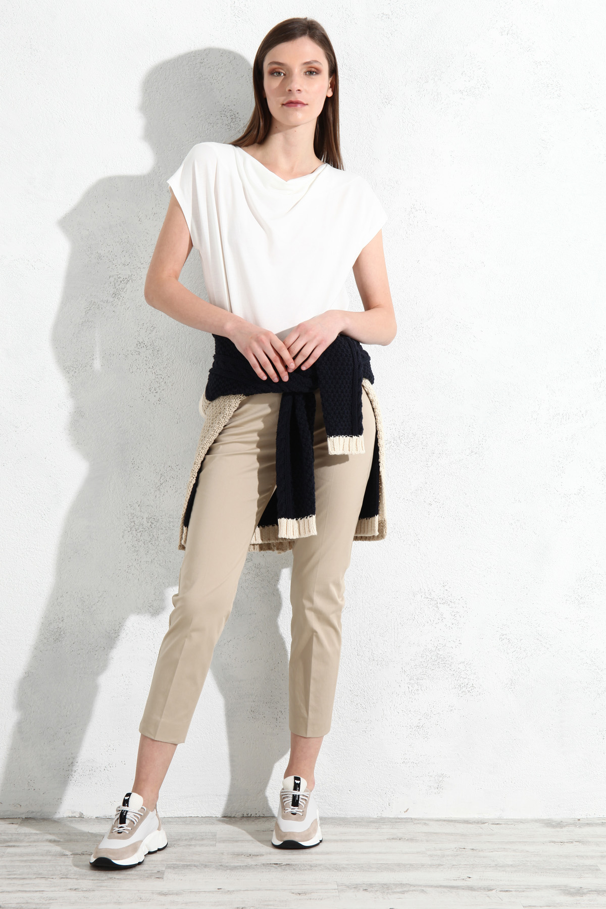 Pantaloni a sigaretta realizzati in gabardine di cotone stretch, con passanti in vita e tasche a doppio filetto con bottone sul retro. Allacciatura nascosta con zip, bottone e gancio.