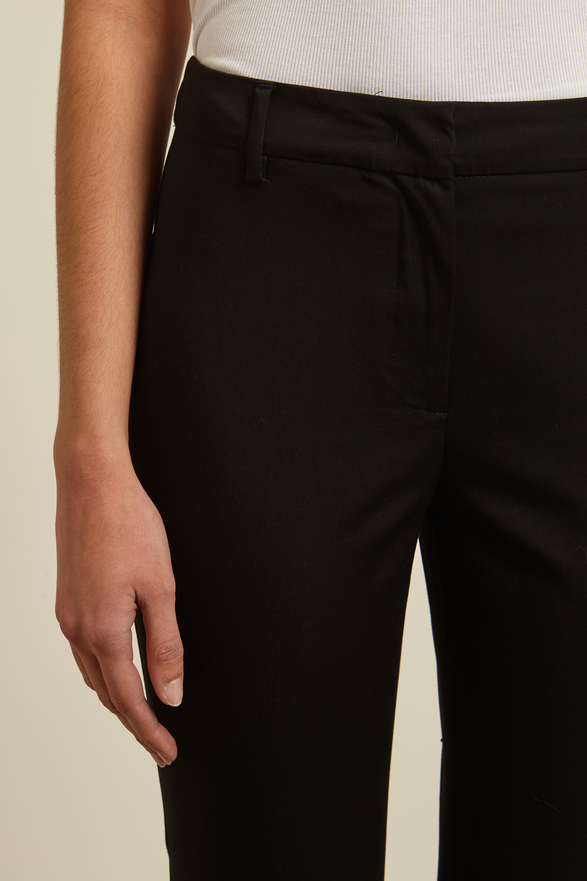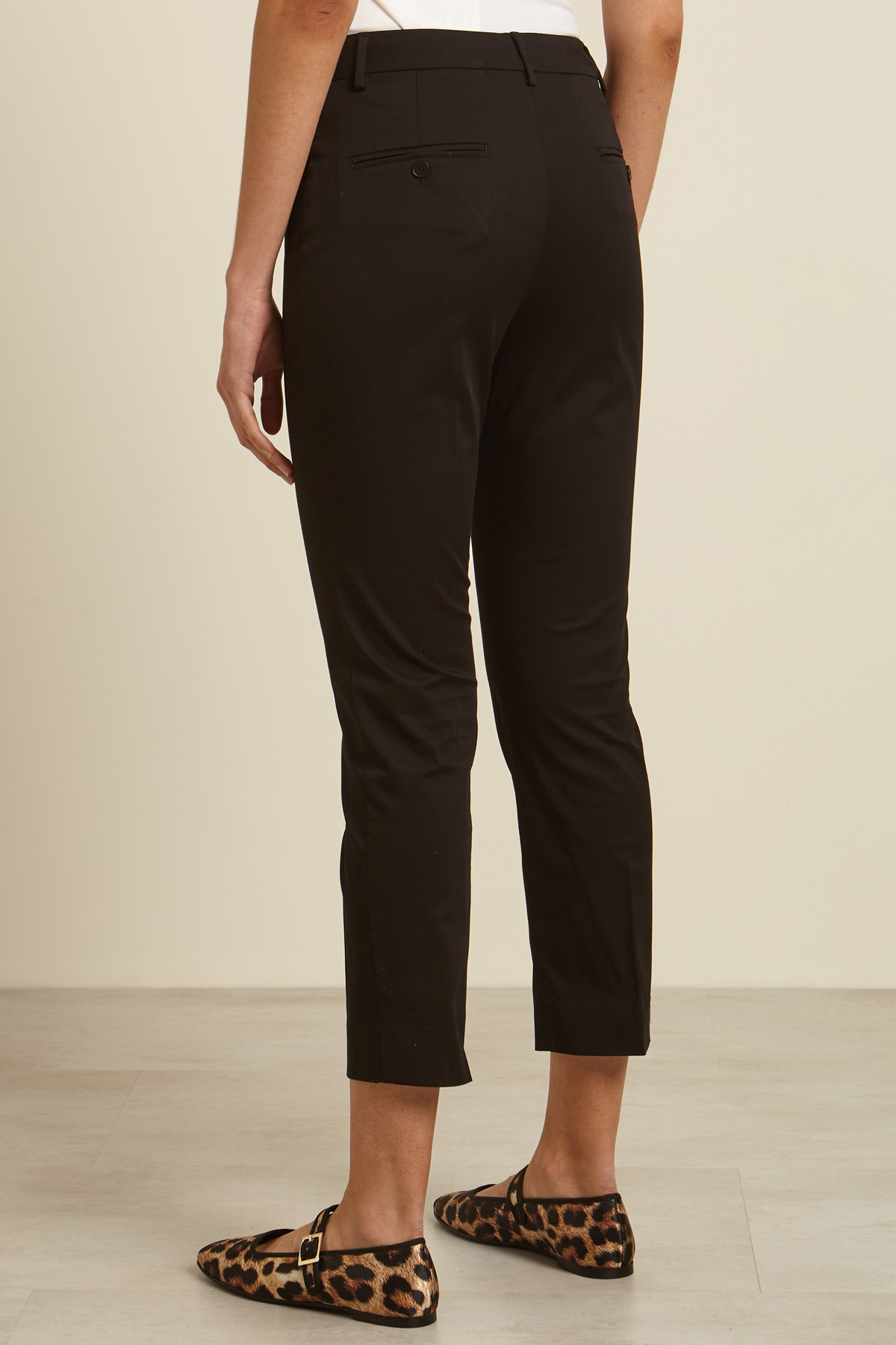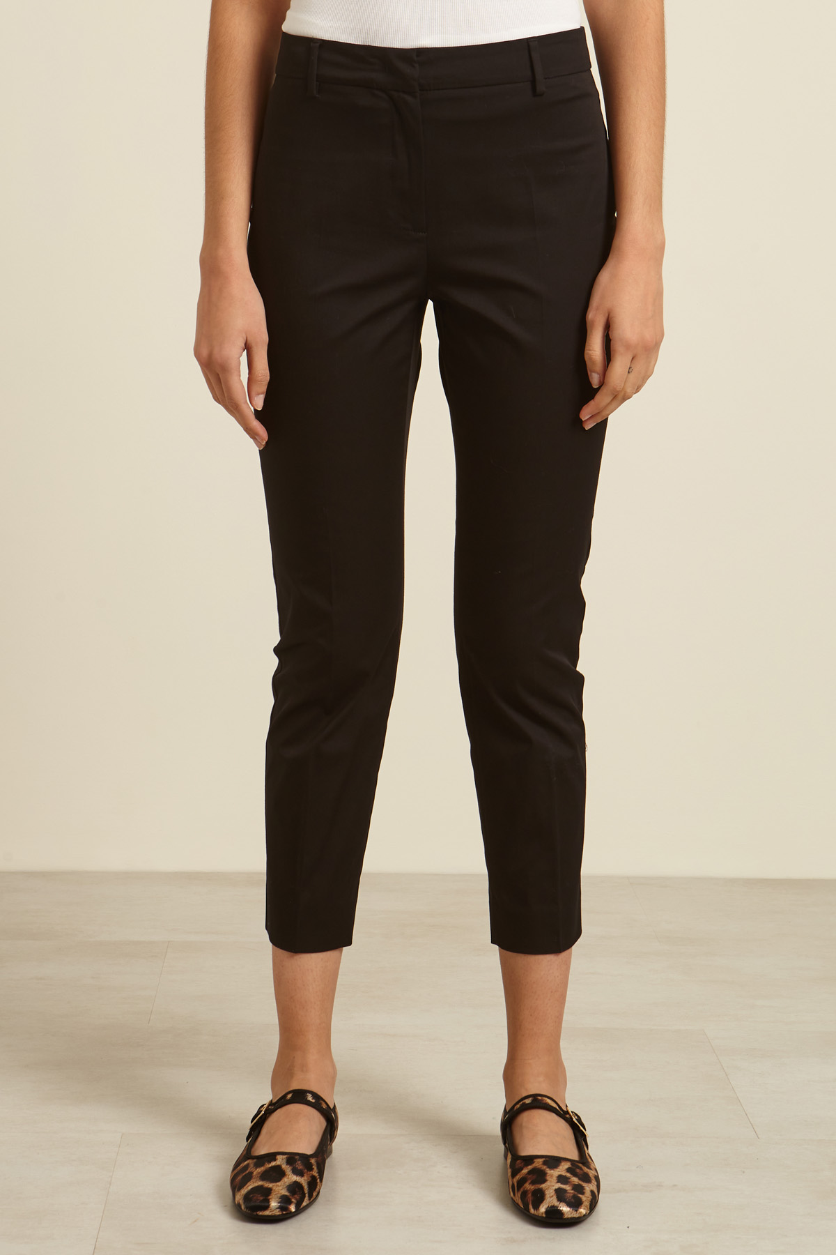 Pantaloni cropped a sigaretta realizzati in levantina di cotone stretch con passanti in vita, tasche doppio filetto nel retro e piega stirata in lunghezza. Allacciatura nascosta tramite zip, bottone e gancio.