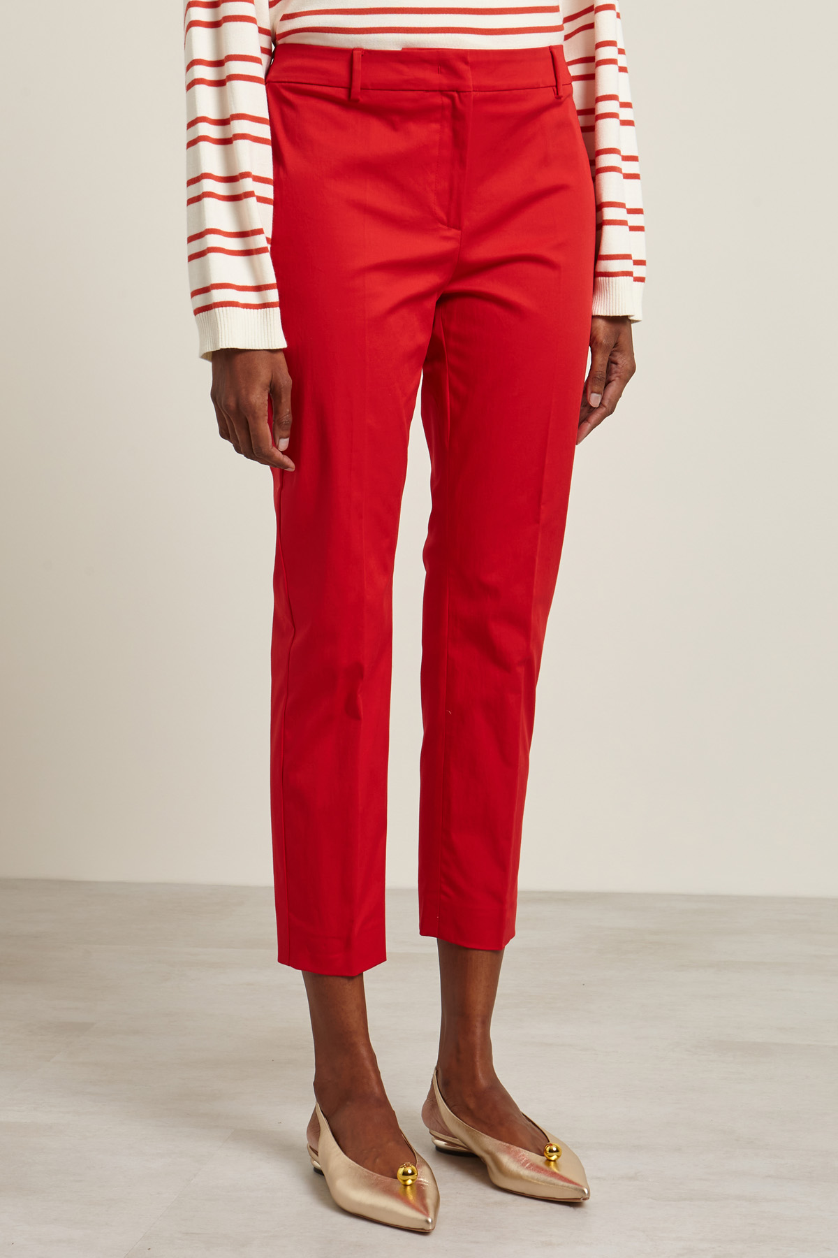 Pantaloni cropped a sigaretta realizzati in levantina di cotone stretch con passanti in vita, tasche doppio filetto nel retro e piega stirata in lunghezza. Allacciatura nascosta tramite zip, bottone e gancio.