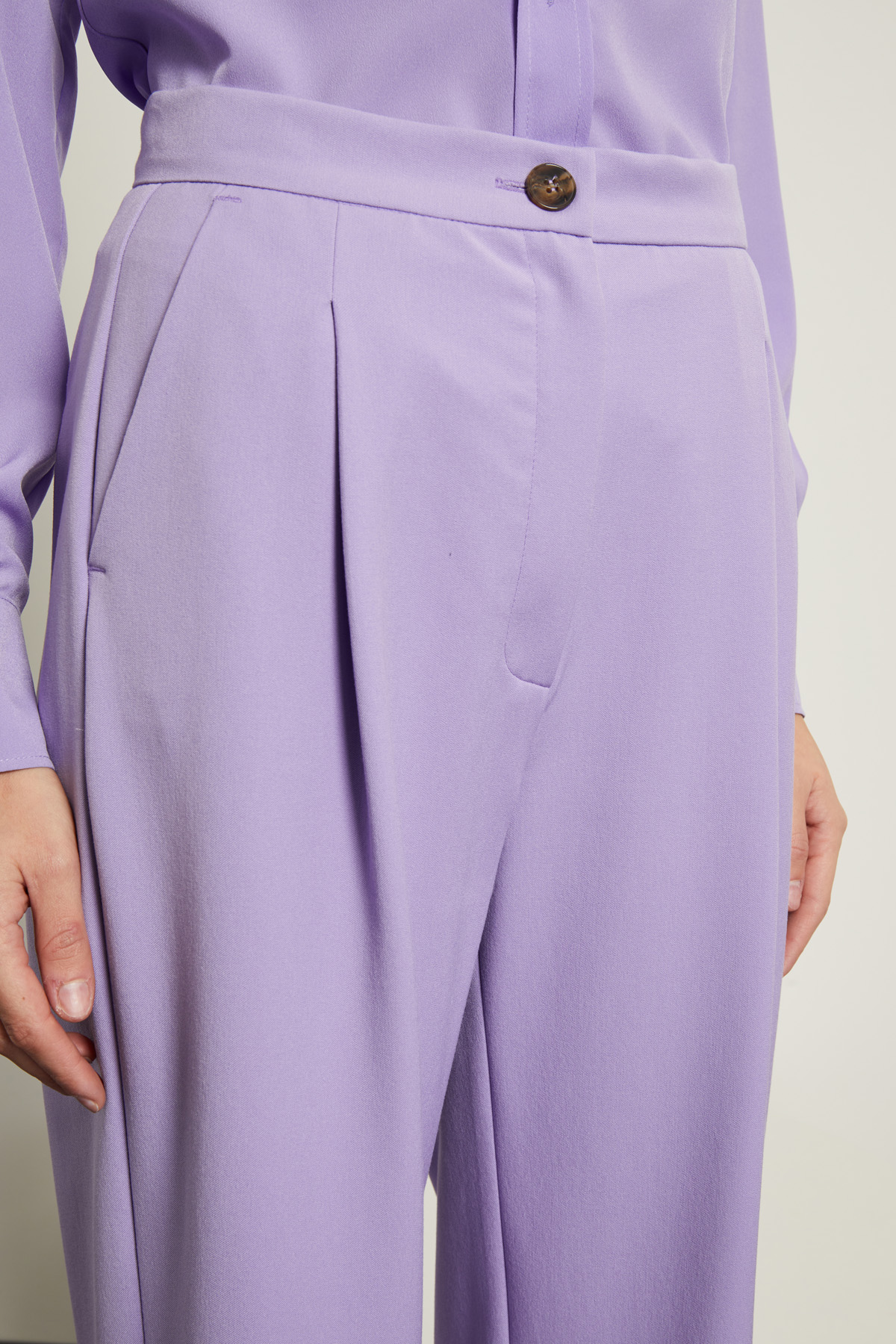 Pantaloni a palazzo realizzati in tessuto diagonale di misto viscosa stretch, con cintone e pieghe cucite in vita, tasche alla francese sul davanti. Allacciatura tramite zip nascosta e bottone.