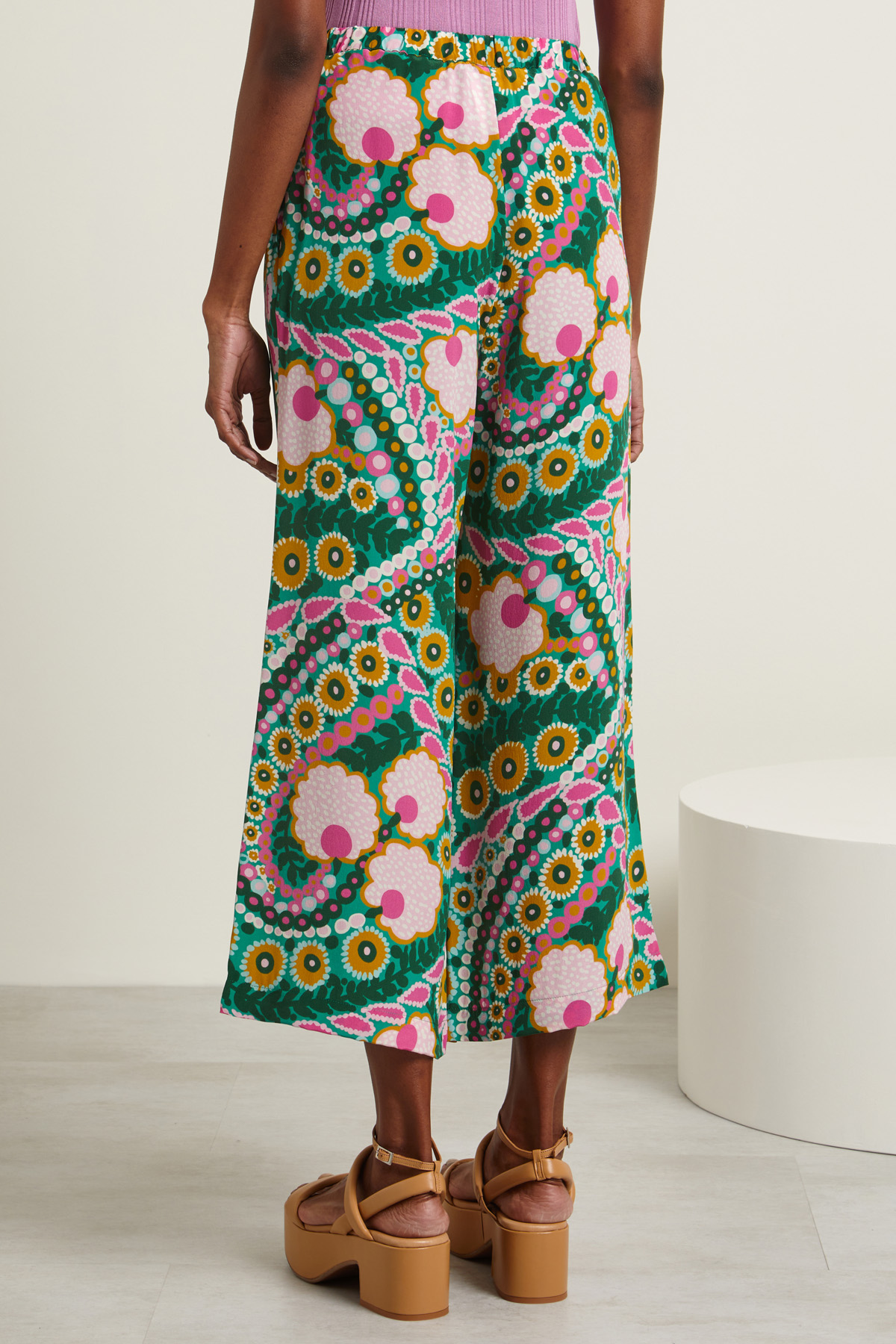 Pantaloni dalla linea fluida realizzati in crêpe de chine di pura seta stampata con inserto elastico in vita e tasche alla francese.