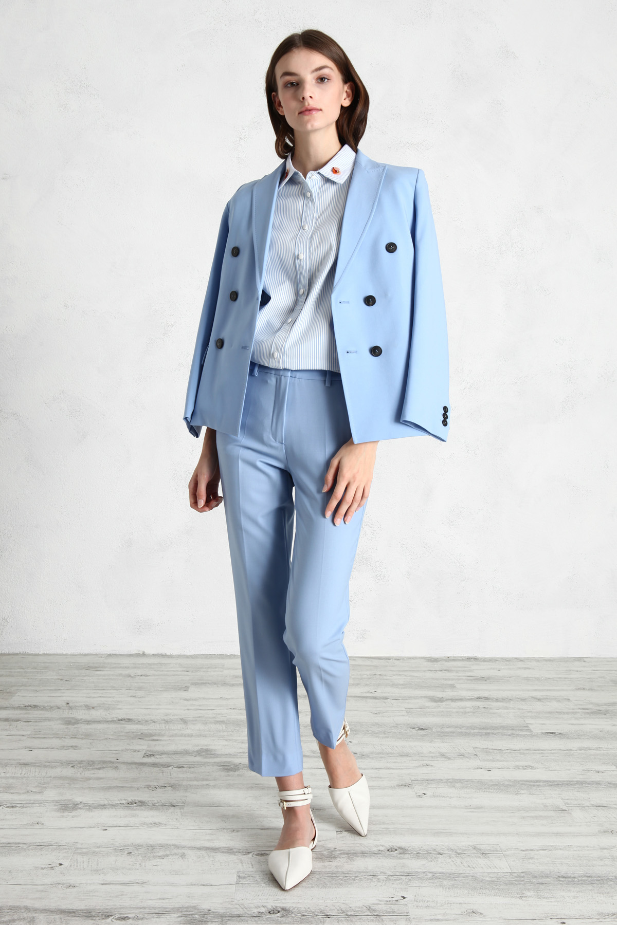 Pantaloni dalla linea dritta realizzati in tela di lana stretch, con tasche alla francese davanti e a filetto con bottone dietro. Allacciatura nascosta con zip, bottone e gancio.