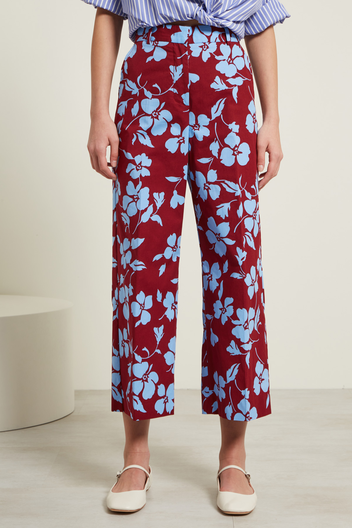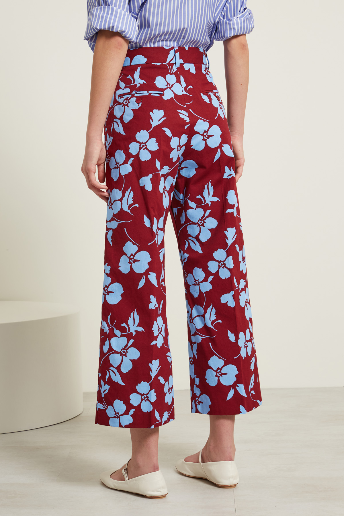 Pantaloni ampi realizzati in faille di cotone stretch stampato, con passanti in vita, tasche alla francese davanti e doppio filetto con bottone nel retro. Allacciatura nascosta tramite zip, bottone e gancio.