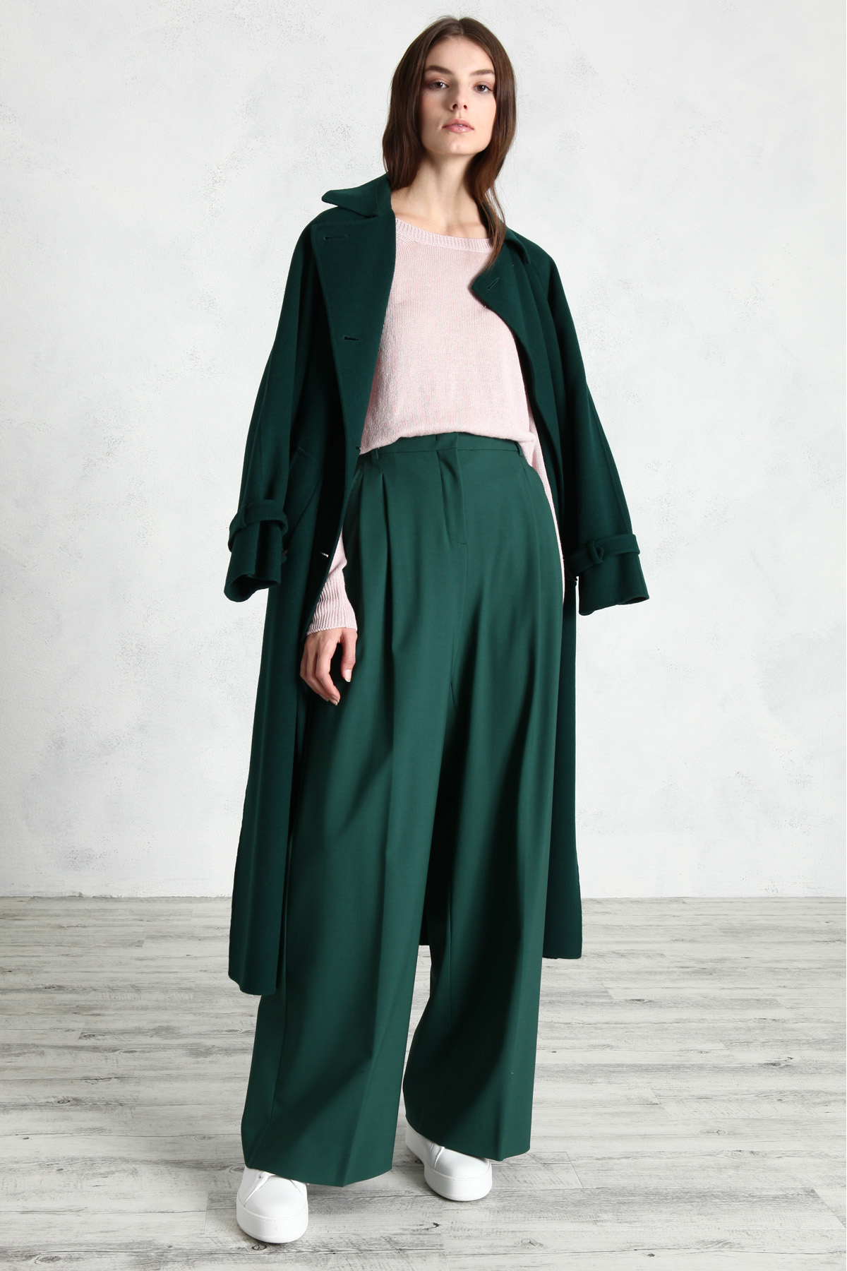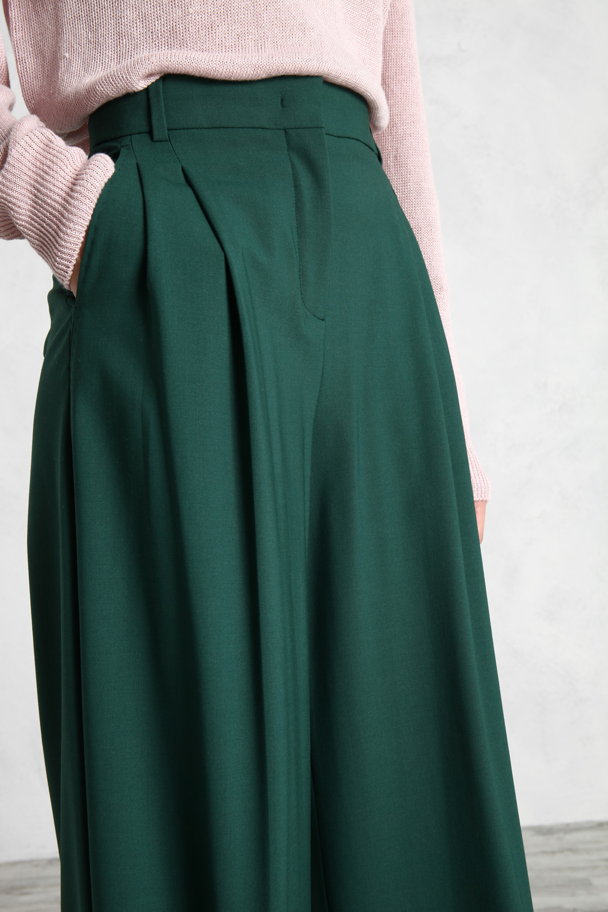 Pantaloni a palazzo realizzati in tela di lana stretch, con pieghe sul davanti e tasche laterali alla francese. Allacciatura nascosta con zip, bottone e gancio.