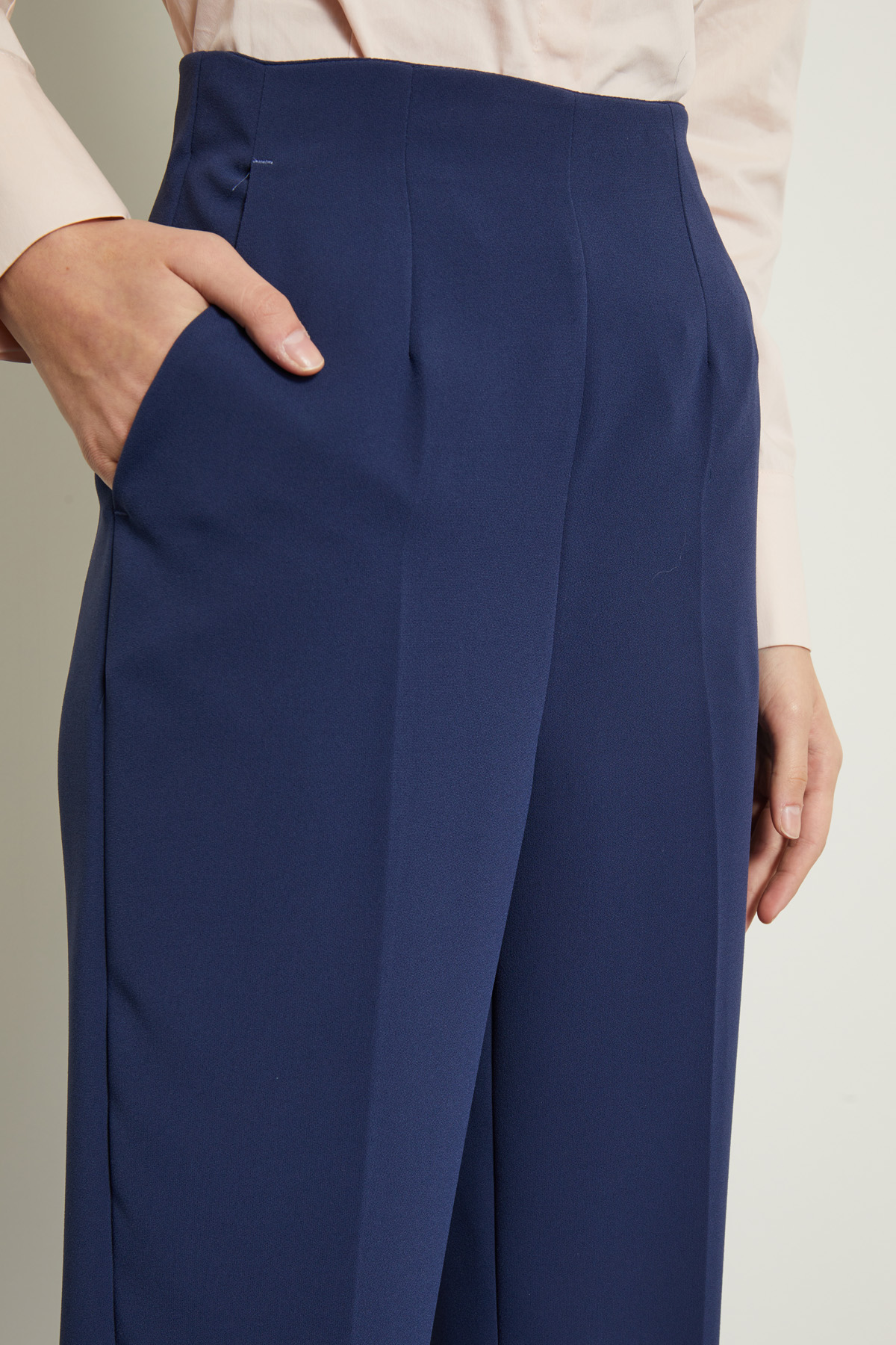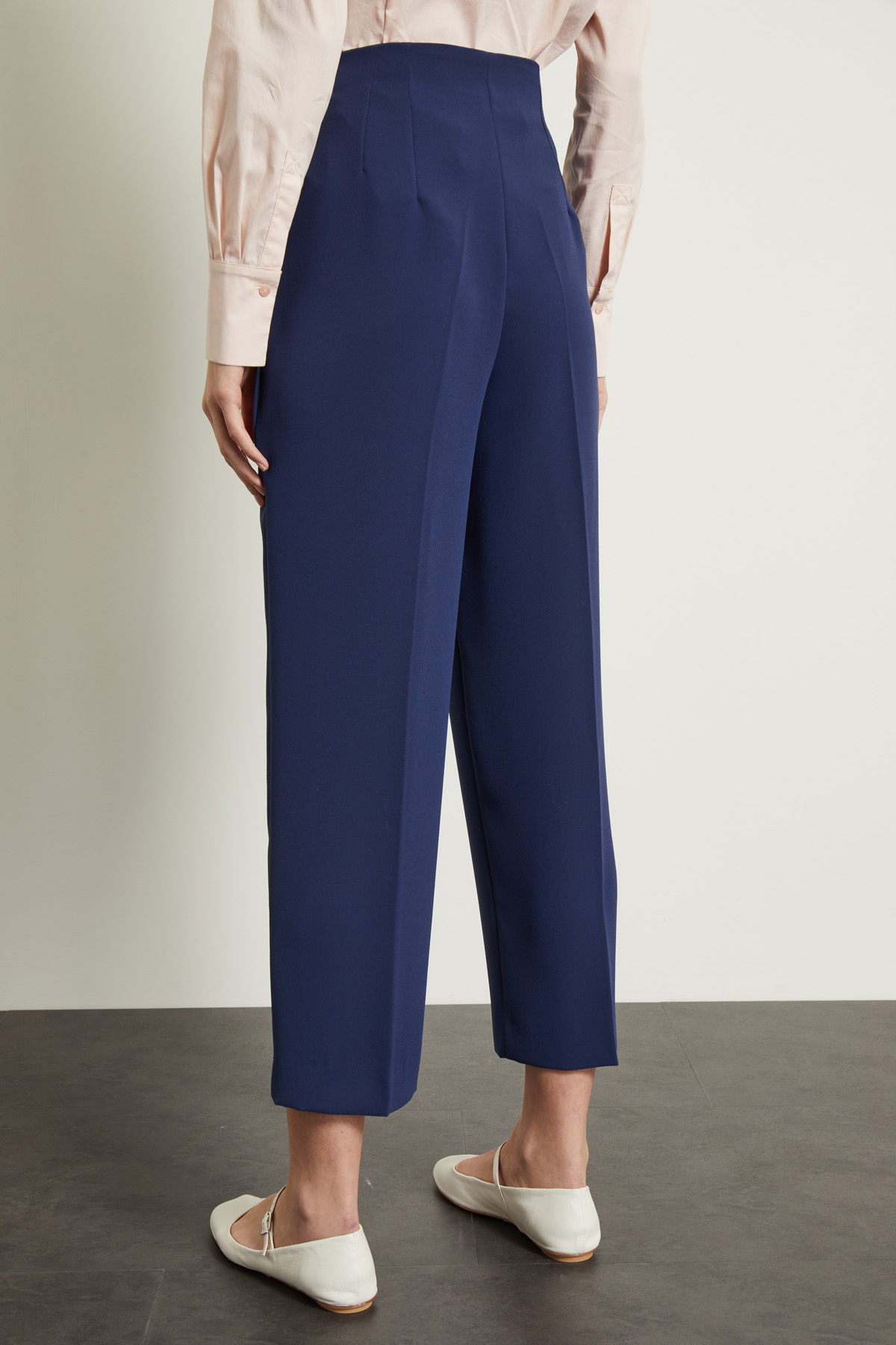 Pantaloni carrot realizzati in cady, con piega stirata, pinces in vita e tasche alla francese. Allacciatura tramite zip invisibile e gancetto sul fianco.