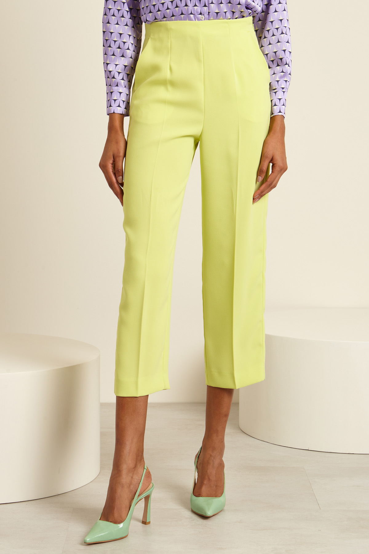 Pantaloni carrot realizzati in cady, con piega stirata, pinces in vita e tasche alla francese. Allacciatura tramite zip invisibile e gancetto sul fianco.