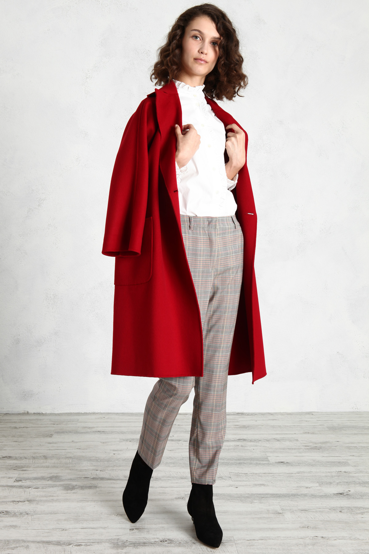 Pantaloni a sigaretta realizzati in tessuto di lana stretch tinto filo, con passanti in vita, tasche laterali alla francese e a filetto con bottone nel retro. allacciatura nascosta tramite zip, bottone e gancio.