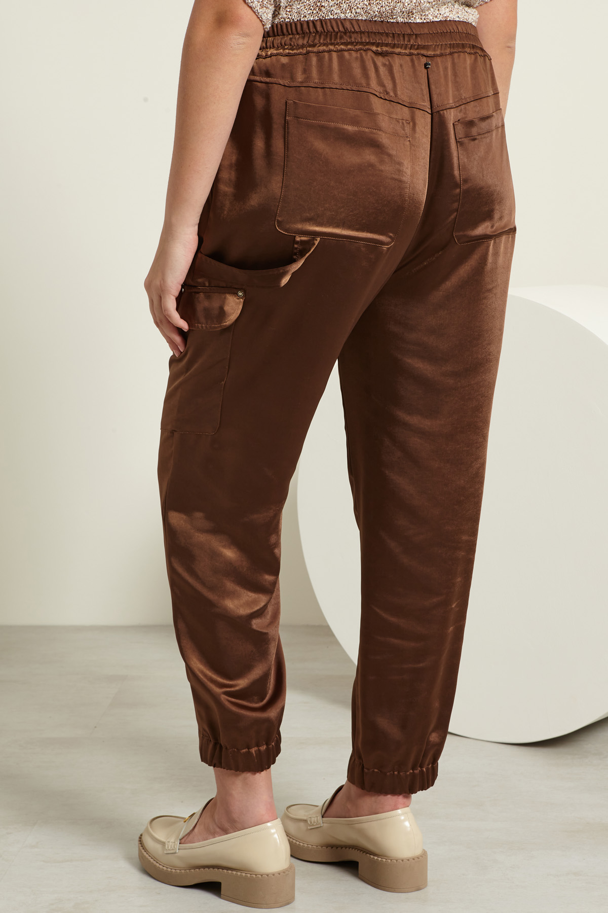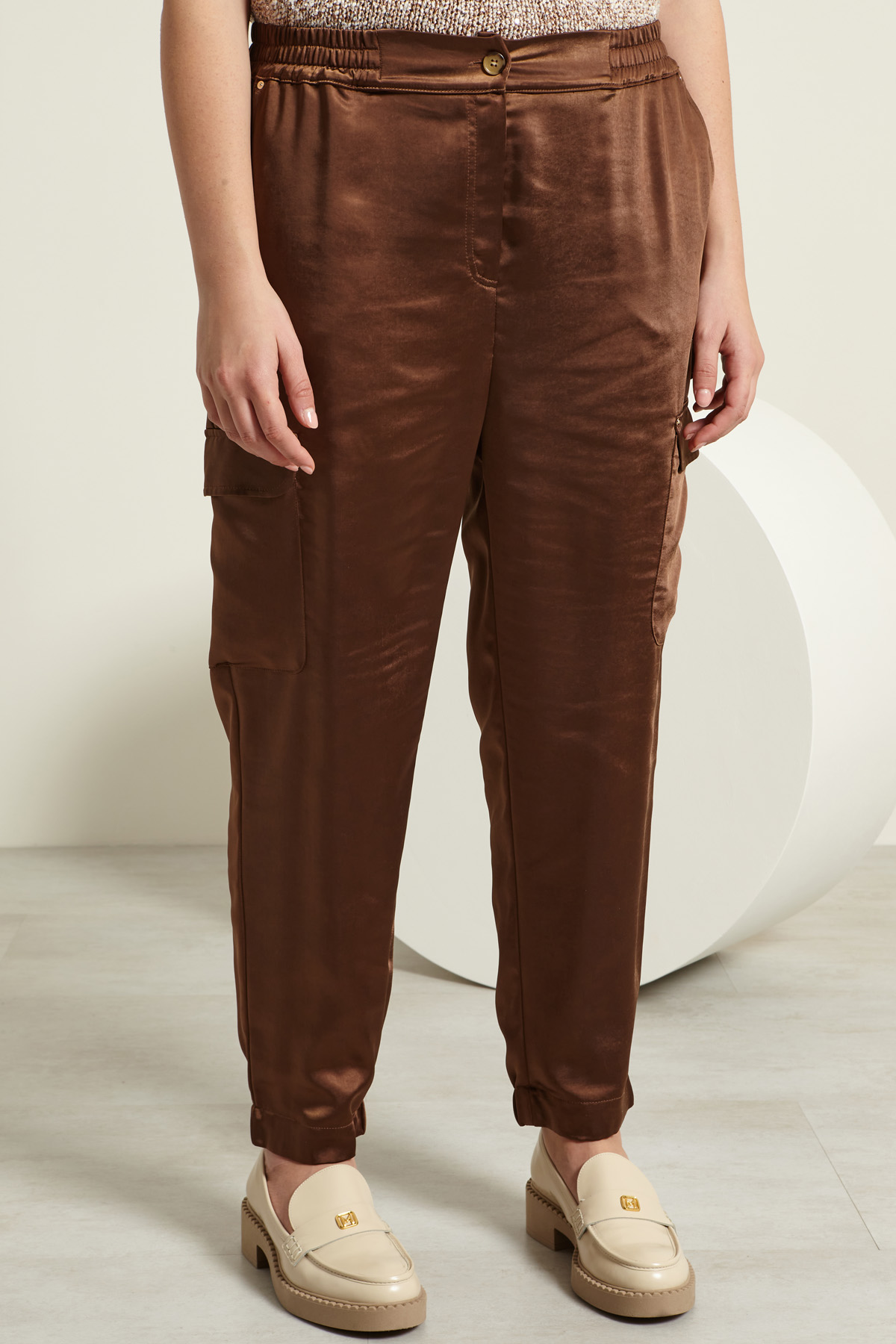 Pantaloni baggy realizzati in raso, con inserto elastico in vita e al fondo, tasche alla francese davanti, applicate nel retro e lungo la gamba con patta, dettaglio di cinturino. Allacciatura tramite zip nascosta e bottone.