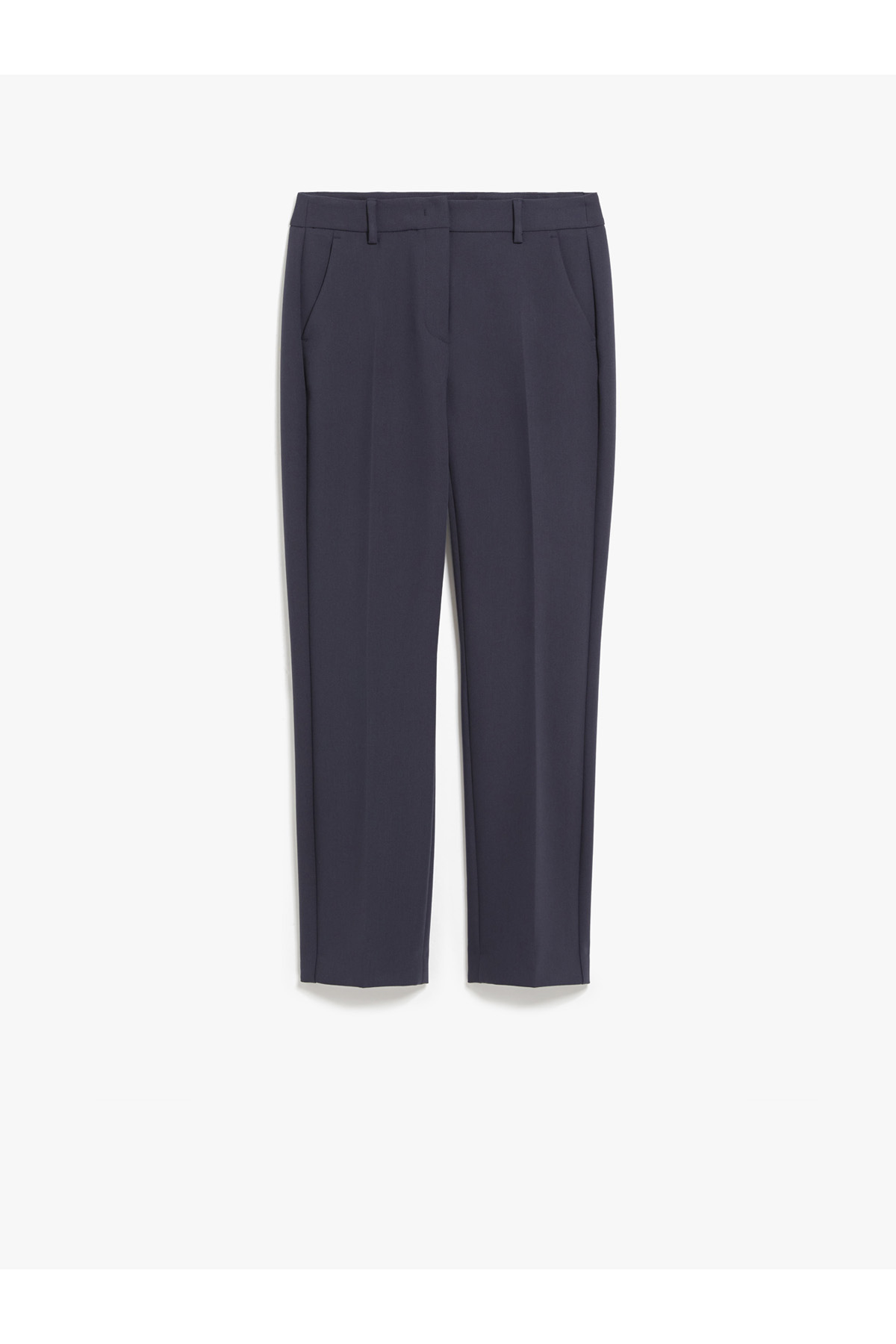 Pantaloni slim realizzati in tessuto diagonale di misto viscosa stretch, con passanti in vita, tasche alla francese sul davanti e a doppio filetto con bottone dietro. Allacciatura nascosta tramite zip, bottone e gancio.