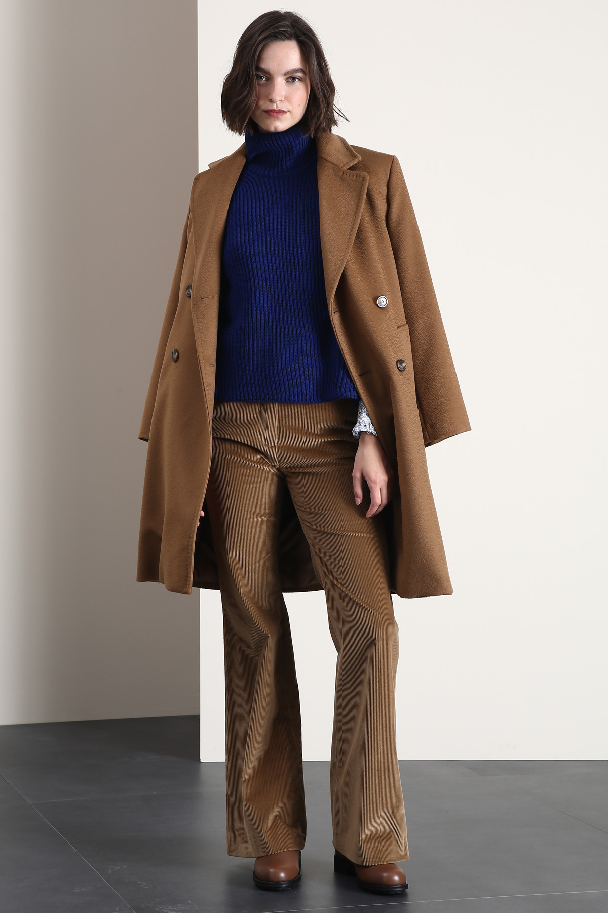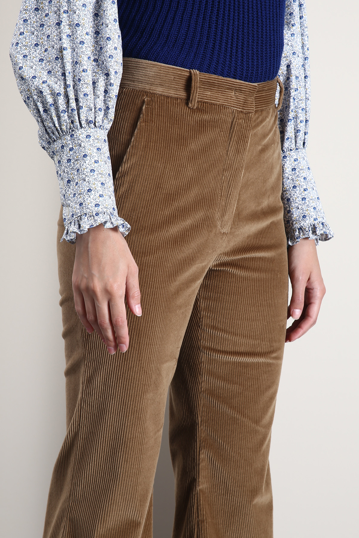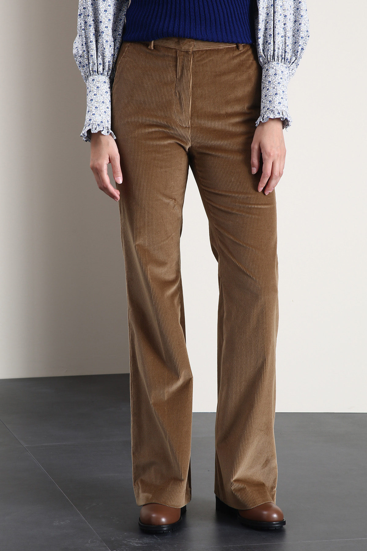 Pantaloni flare realizzati in velluto a coste di cotone stretch, con passanti in vita, tasche laterali alla francese e a filetto con bottone nel retro, allacciatura nascosta tramite zip, bottone e gancio.