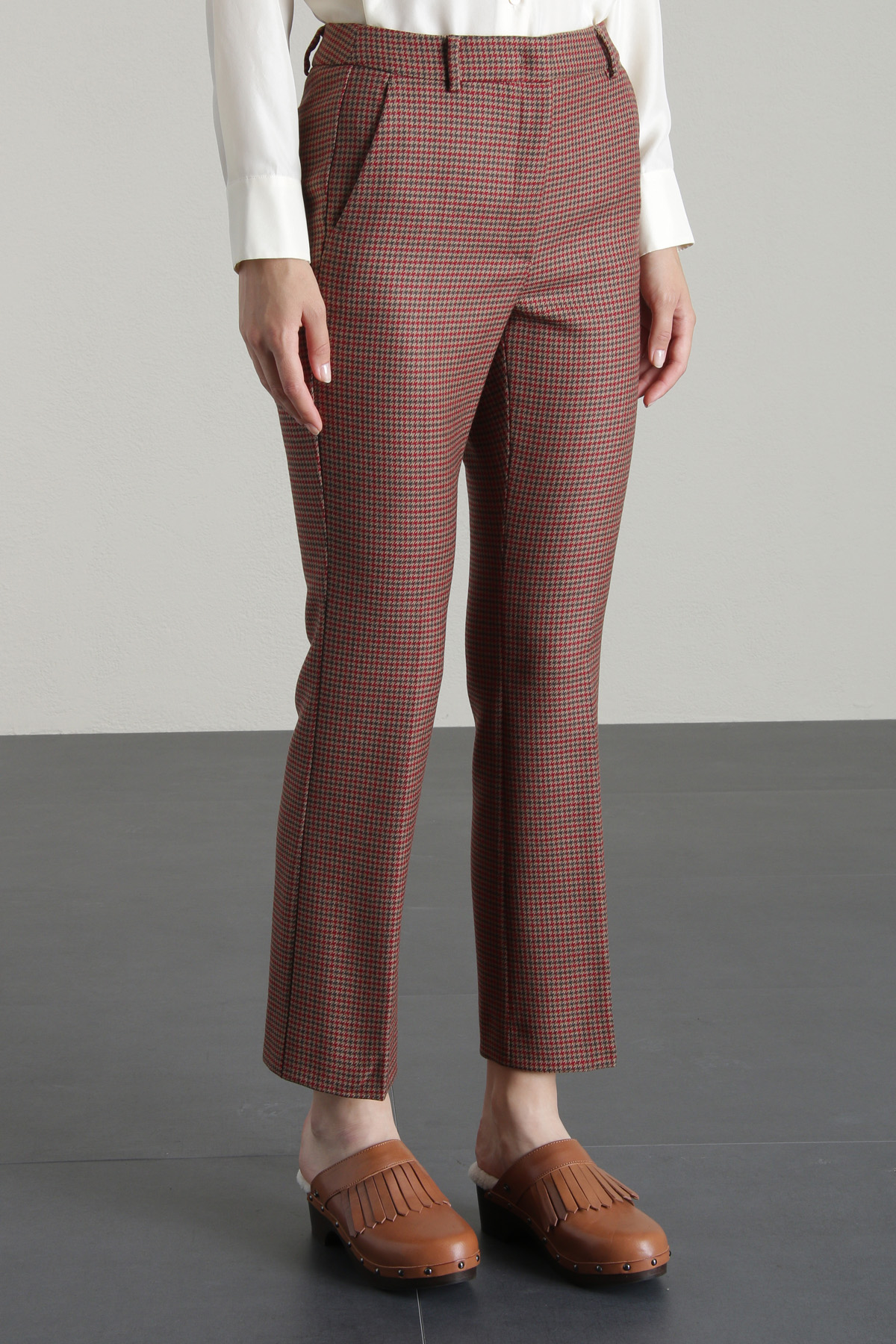 Pantaloni dalla linea dritta realizzati in batavia di pura lana tinto filo, con passanti in vita, tasche laterali alla francese e a filetto con bottone sul retro. Allacciatura nascosta tramite zip, bottone e gancio.