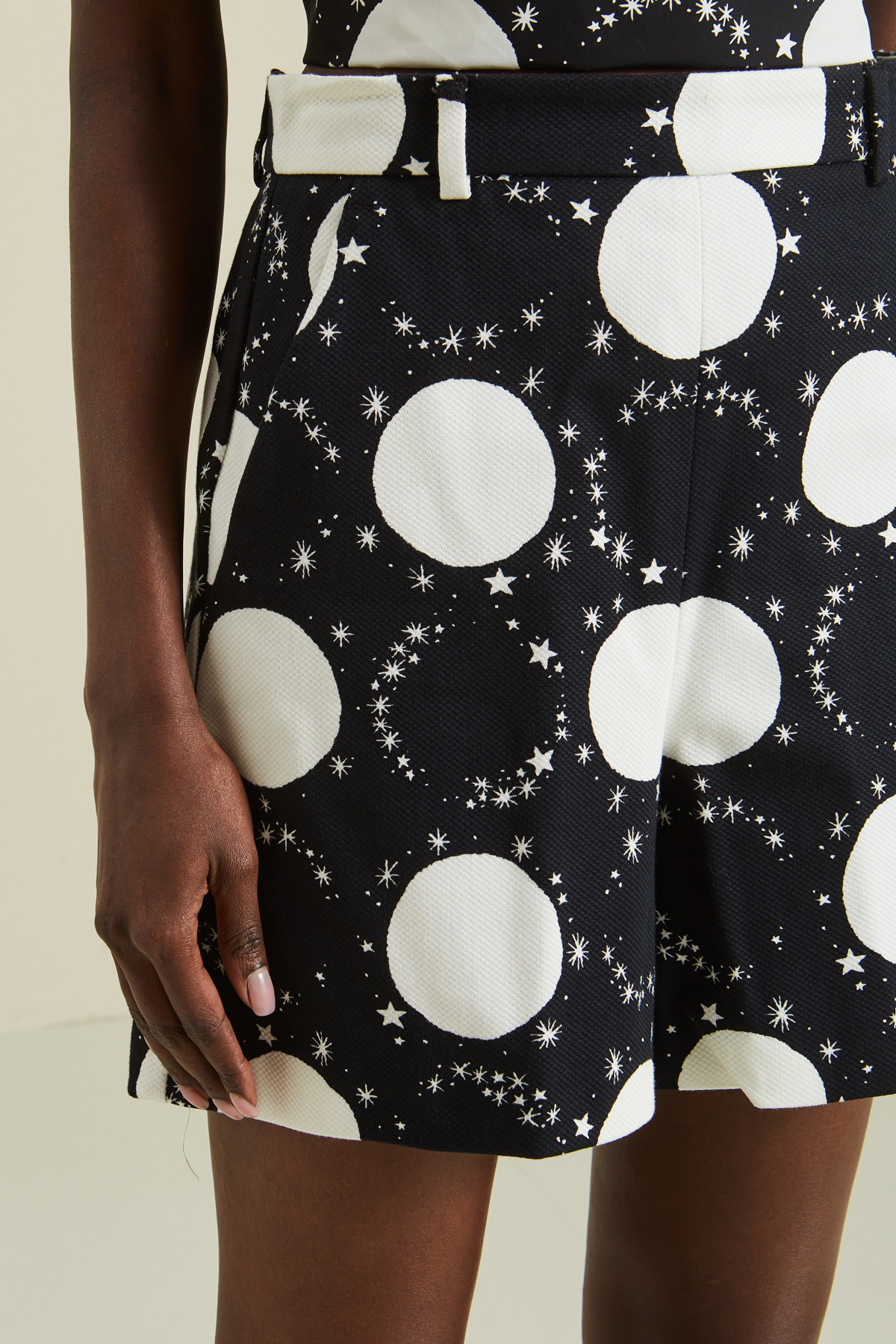 Shorts dalla linea svasata realizzati in cotone stretch armaturato, con cintone e passanti in vita, tasche alla francese ai fianchi e a filetto dietro e chiusura tramite zip invisibile e bottone.