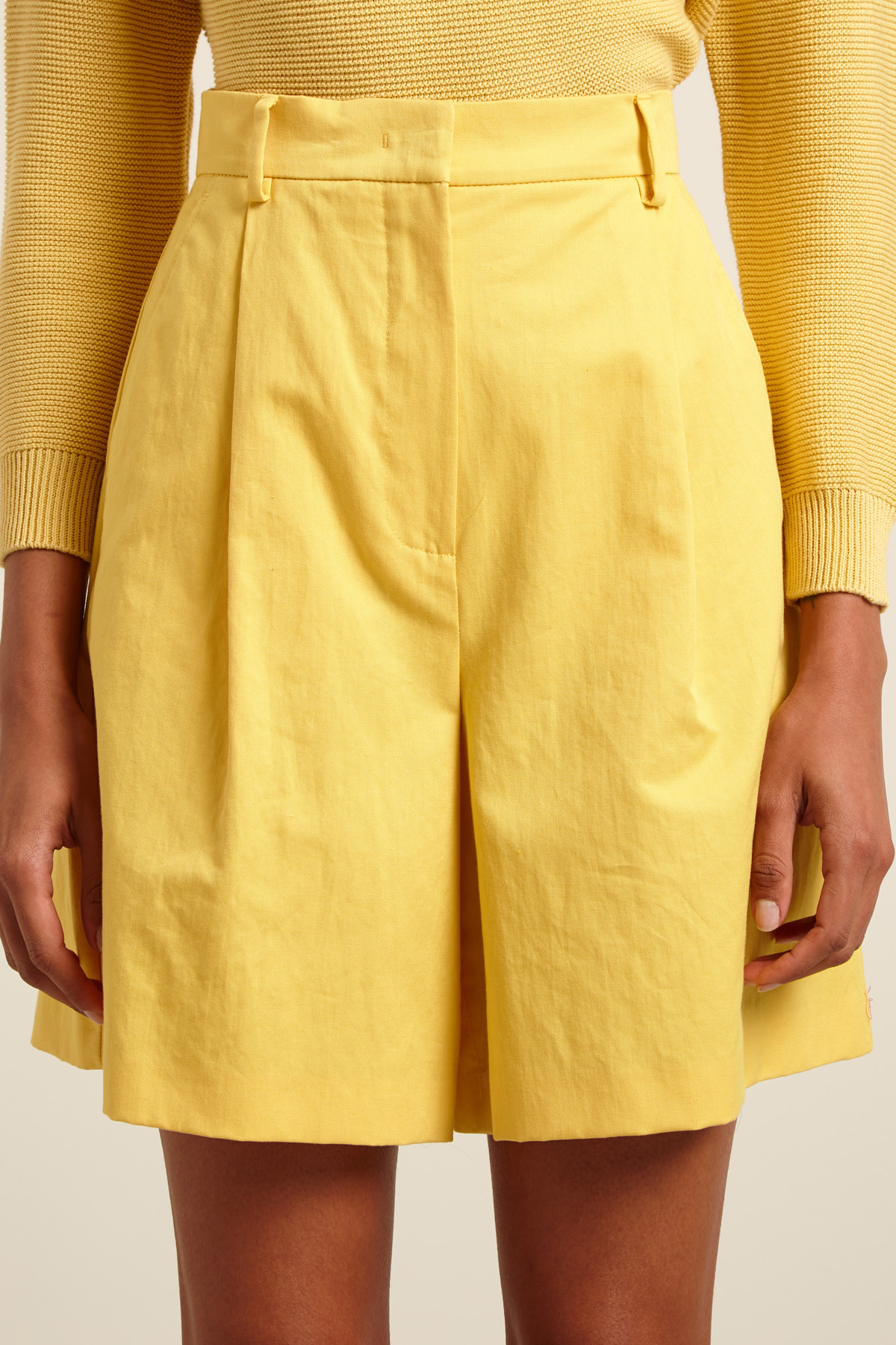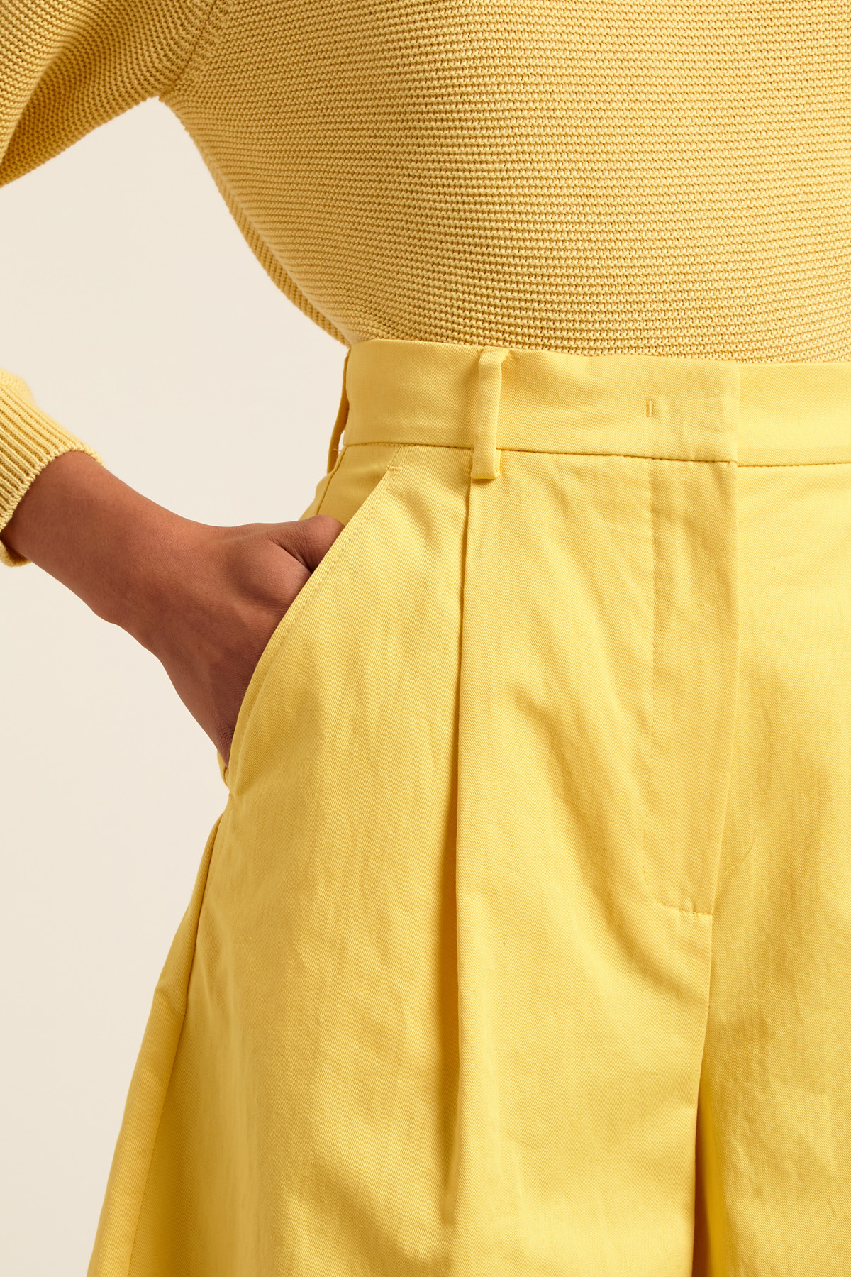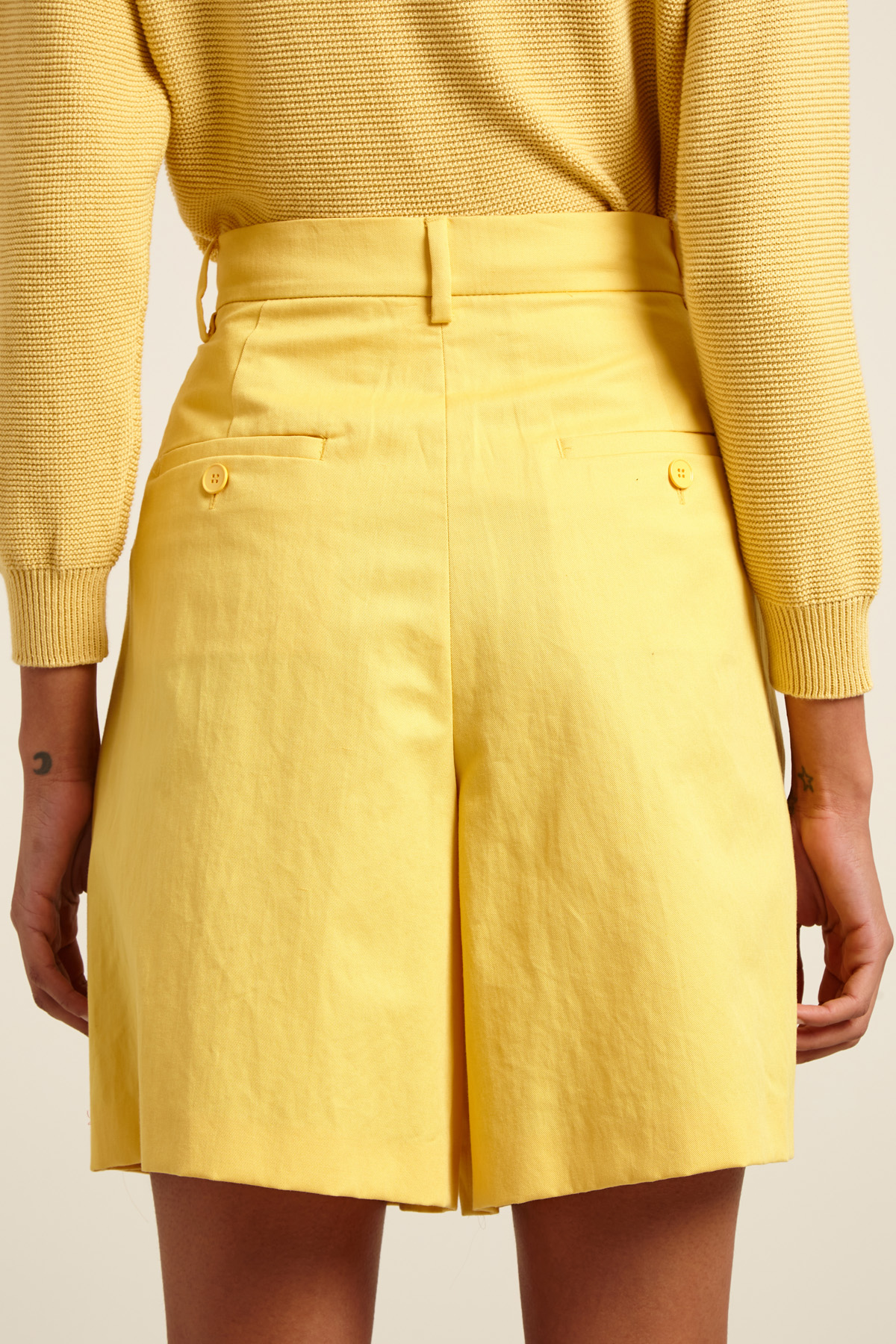 Bermuda dalla linea ampia realizzati in gabardina di misto cotone e lino con passanti in vita, pinces, tasche alla francese davanti e filetto nel retro con bottone. Allacciatura tramite zip, bottone e gancio.