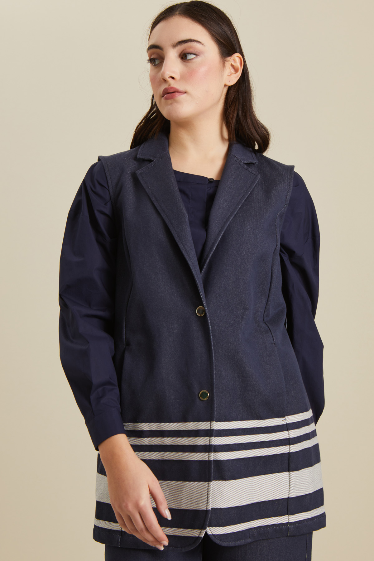 Gilet dalla linea sfiancata realizzato in gabardina di cotone stretch effetto denim, con lavorazione jacquard al fondo, revers, tagli fianchetto davanti e dietro, tasche inserite in cucitura e chiusura a bottoni. Capo sfoderato, dotato di cintura coordinata.