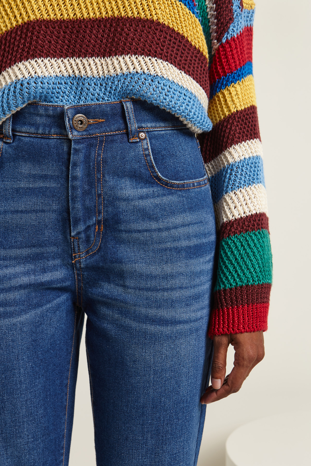 Jeans a vita alta dalla linea dritta realizzato in denim di cotone stretch con passanti in vita e cinque tasche. Allacciatura tramite zip e bottone in metallo.