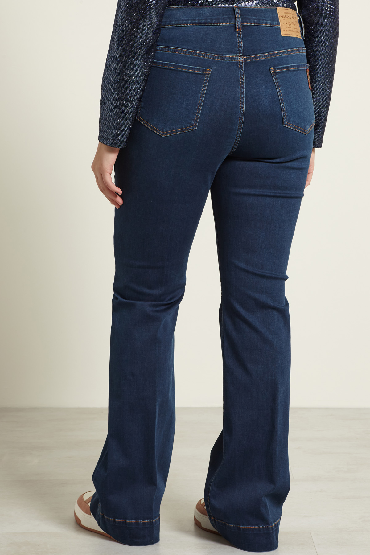 Jeans dalla linea flare realizzati in denim fluido di cotone stretch, con passanti in vita, tasche applicate davanti e dietro. Allacciatura tramite zip nascosta e bottone in metallo.