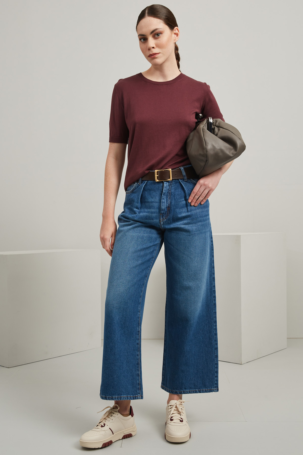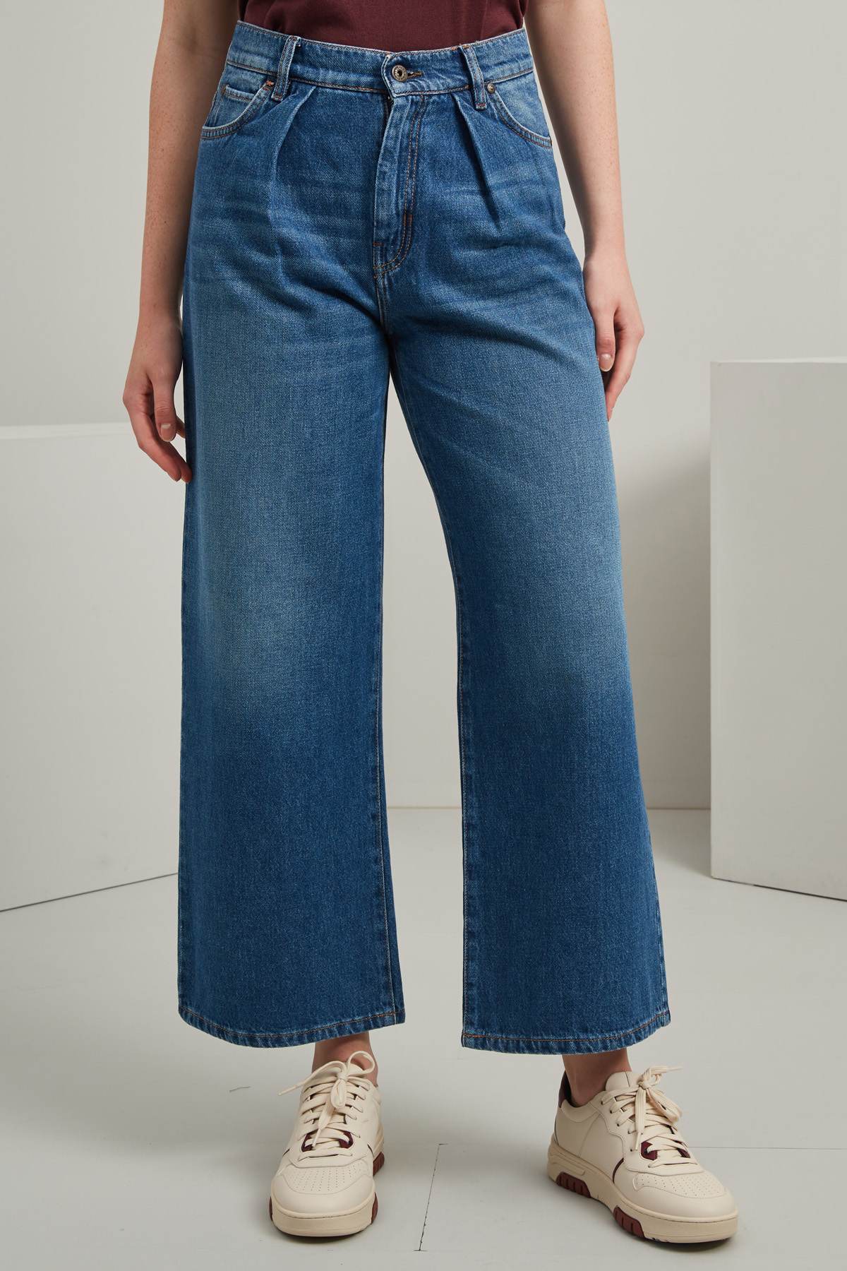 Jeans dalla linea ampia realizzati in denim di puro cotone, con piega cucita sul davanti, passanti in vita, cinque tasche e allacciatura tramite zip nascosta e bottone.
