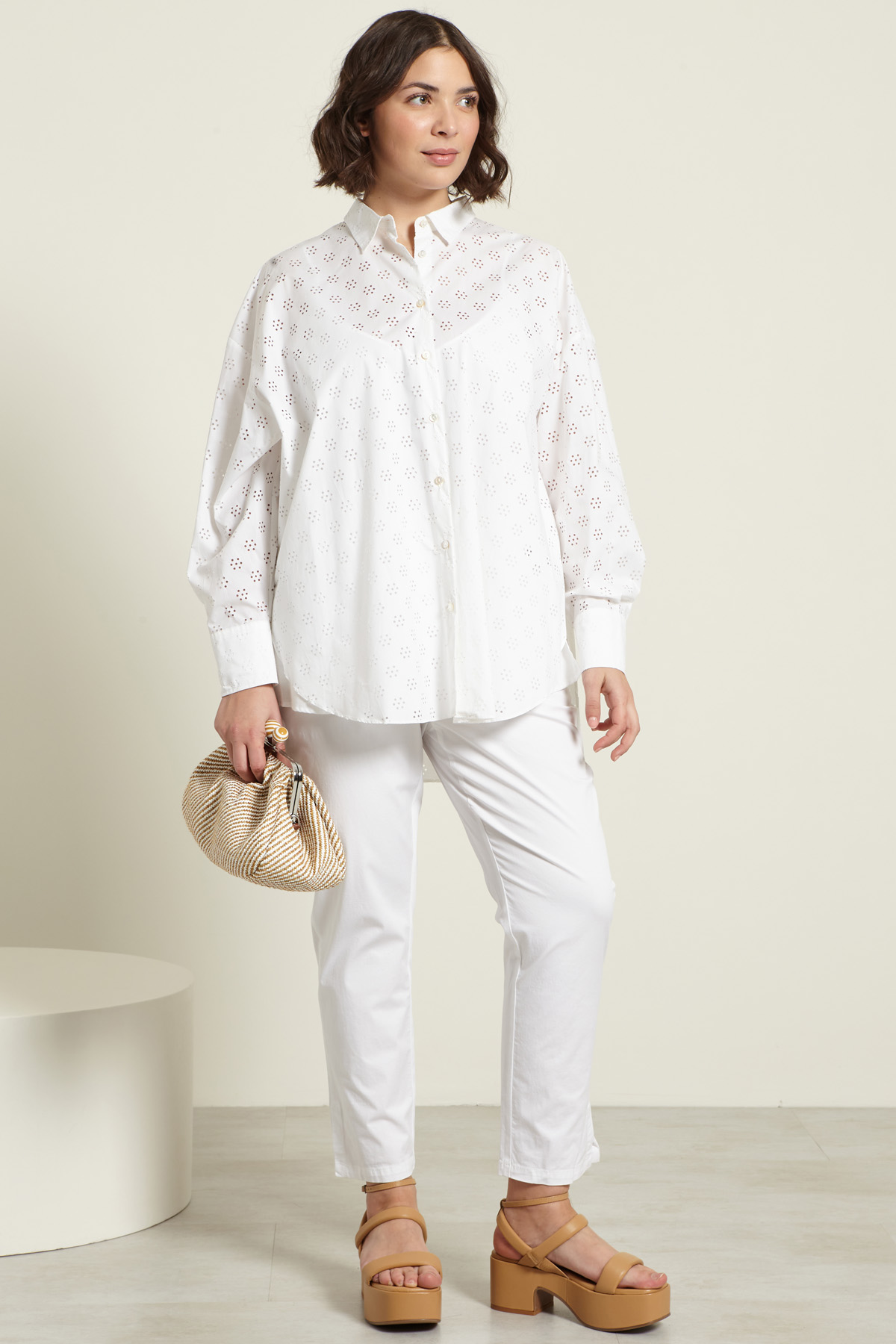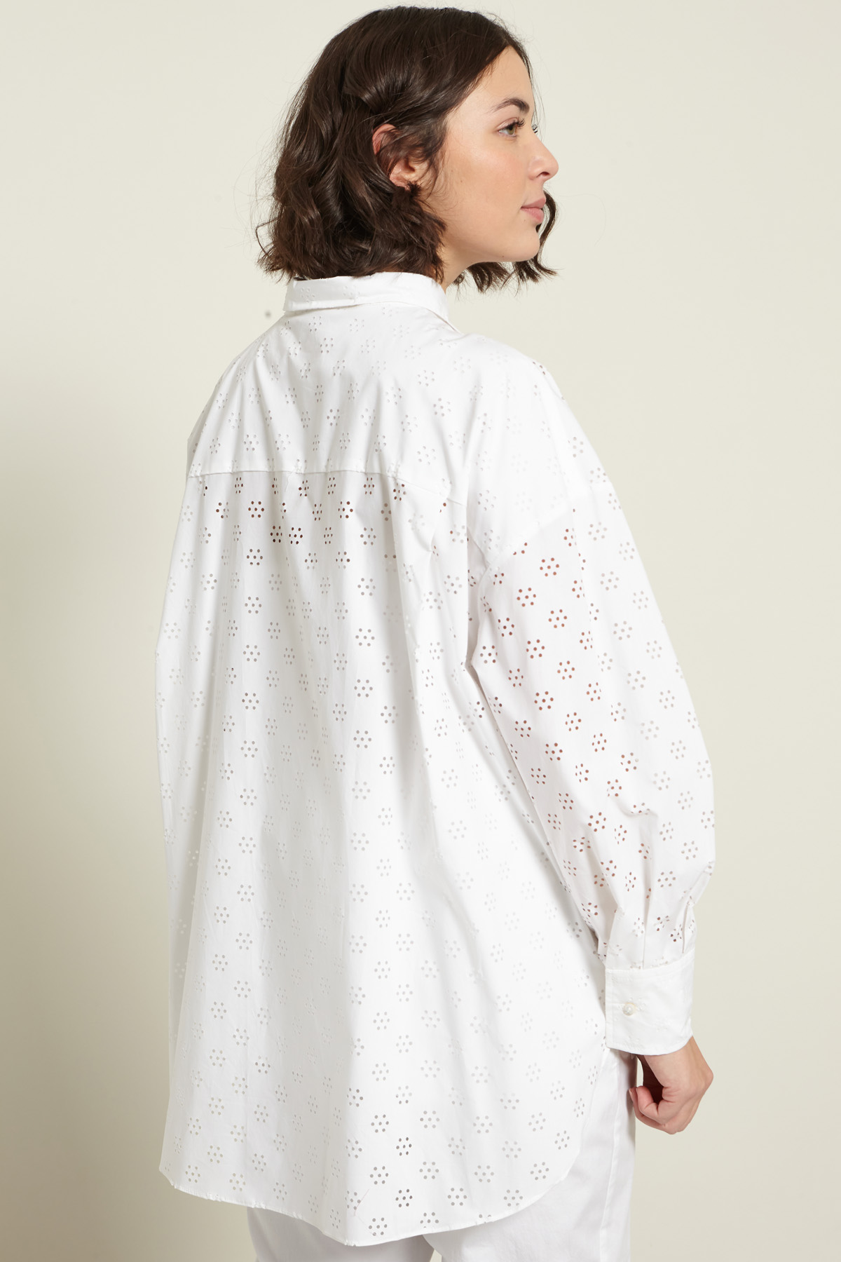 Camicia dalla linea dritta realizzata in popeline di puro cotone, con motivo cut out all over, colletto classico, maniche lunghe con polsino e bottone, spacchetti laterali, carrè nel retro. Allacciatura tramite bottoni a vista. Capo dotato di top sottoveste in abbinamento.