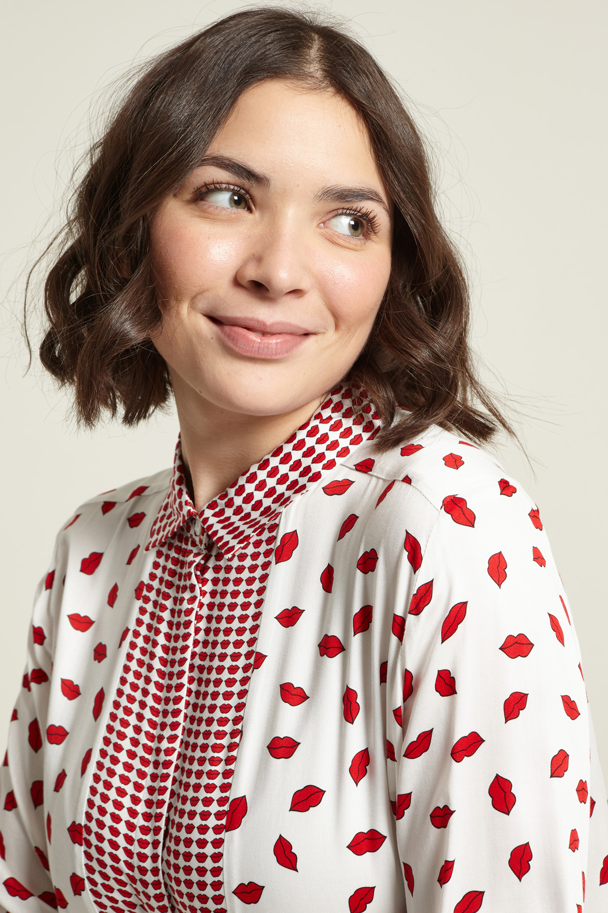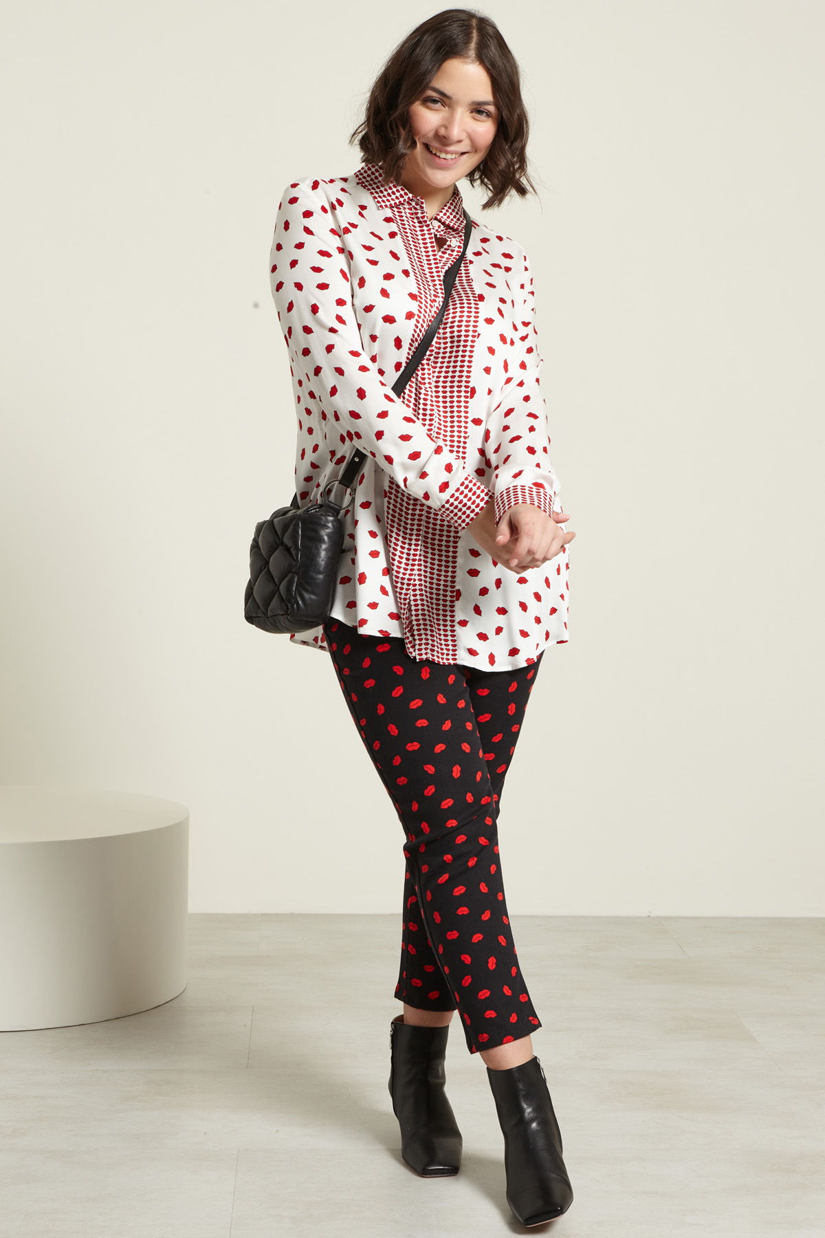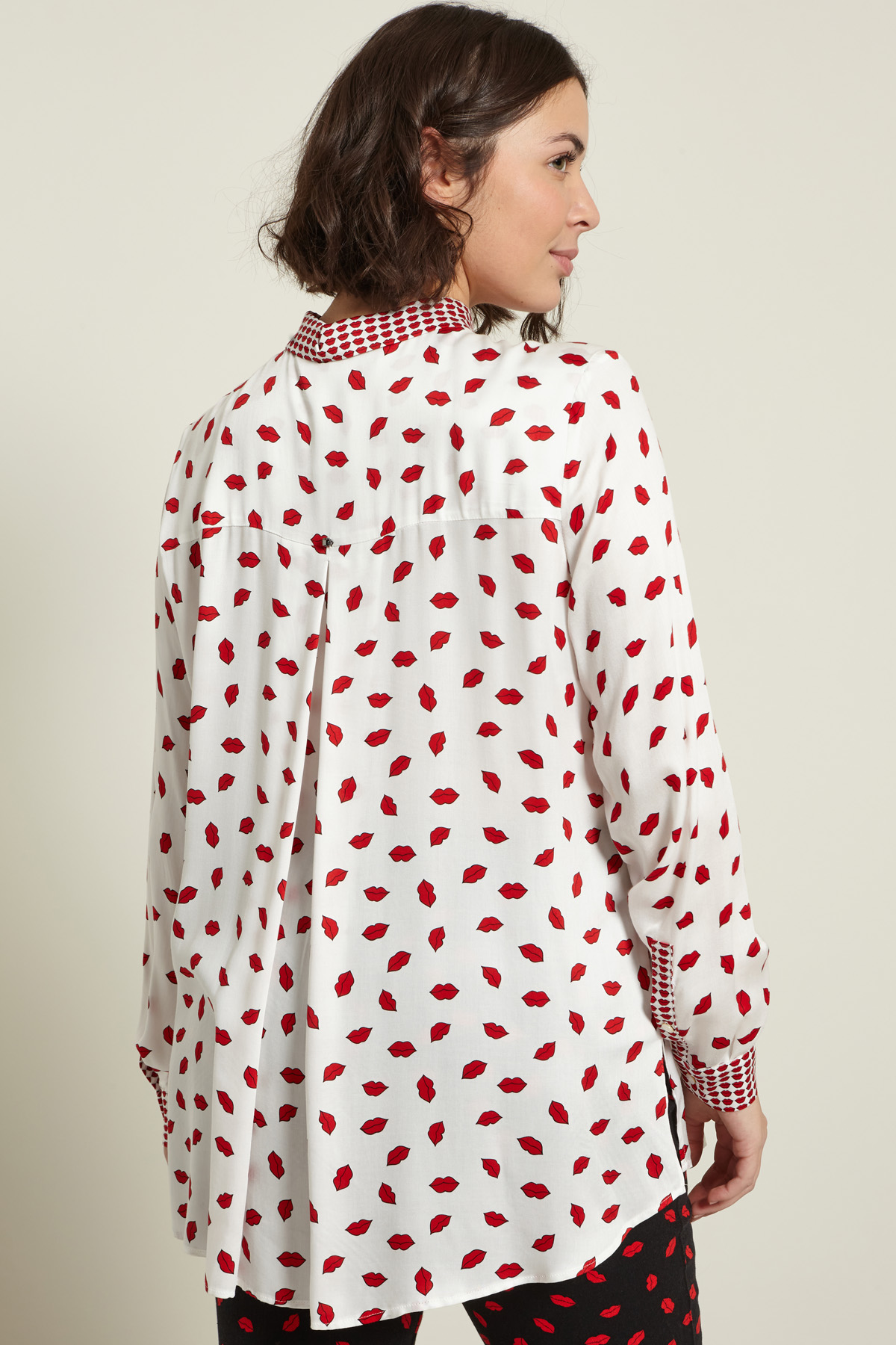 Camicia dalla linea dritta realizzata in raso di pura viscosa stampata, con colletto classico, maniche lunghe con polsino e bottone, spacchetti al fondo, carrè e contropiego nel retro. Allacciatura nascosta tramite bottoni.