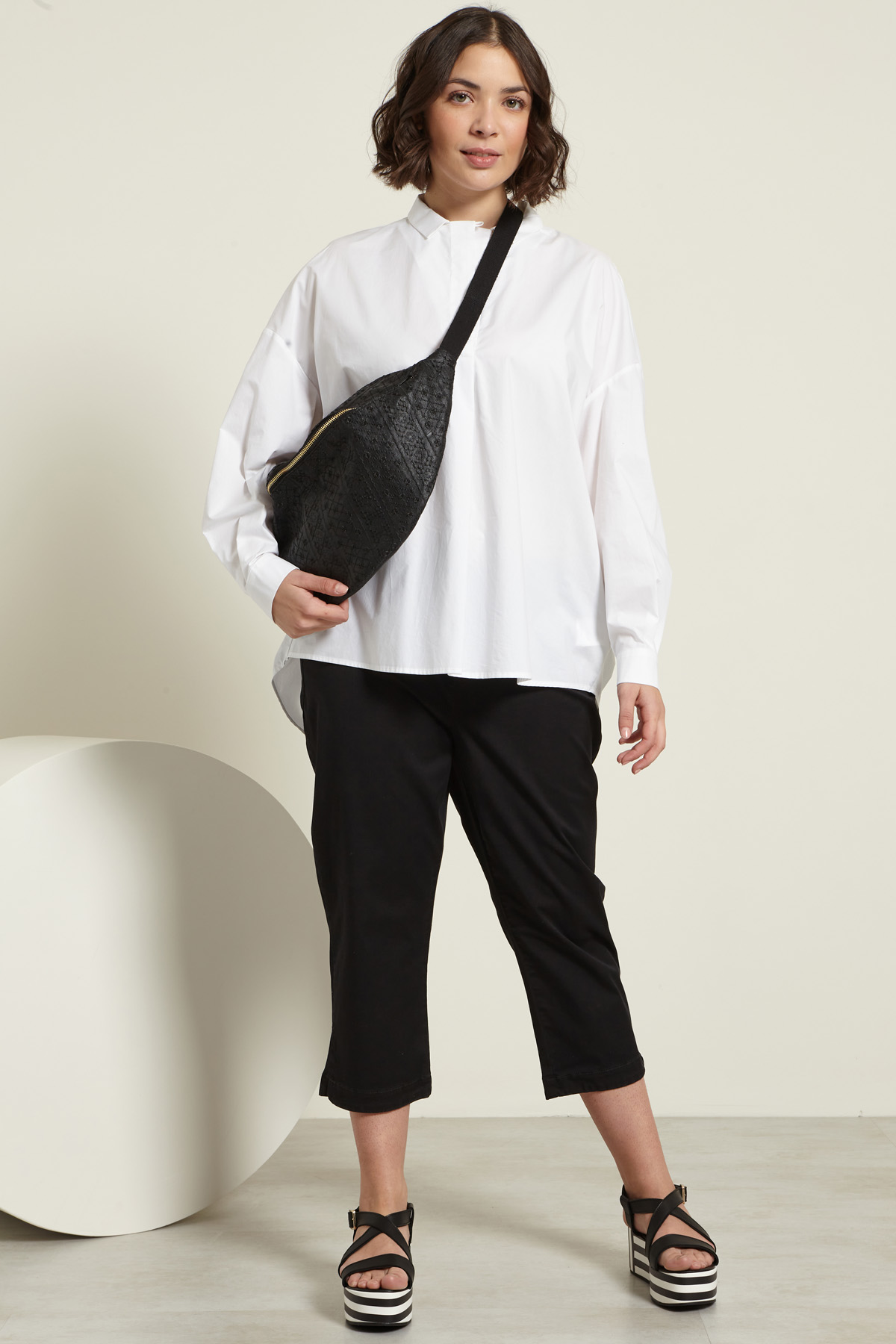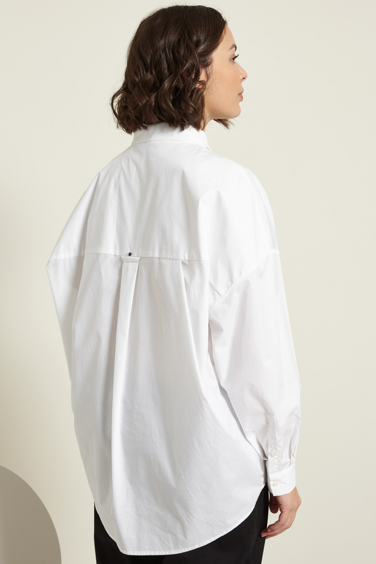 Camicia dalla linea svasata realizzata in popeline di puro cotone, con colletto classico, maniche lunghe con polsino e bottone, contropiego sul davanti, carrè e cannoncino nel retro. Allacciatura nascosta tramite bottoni.