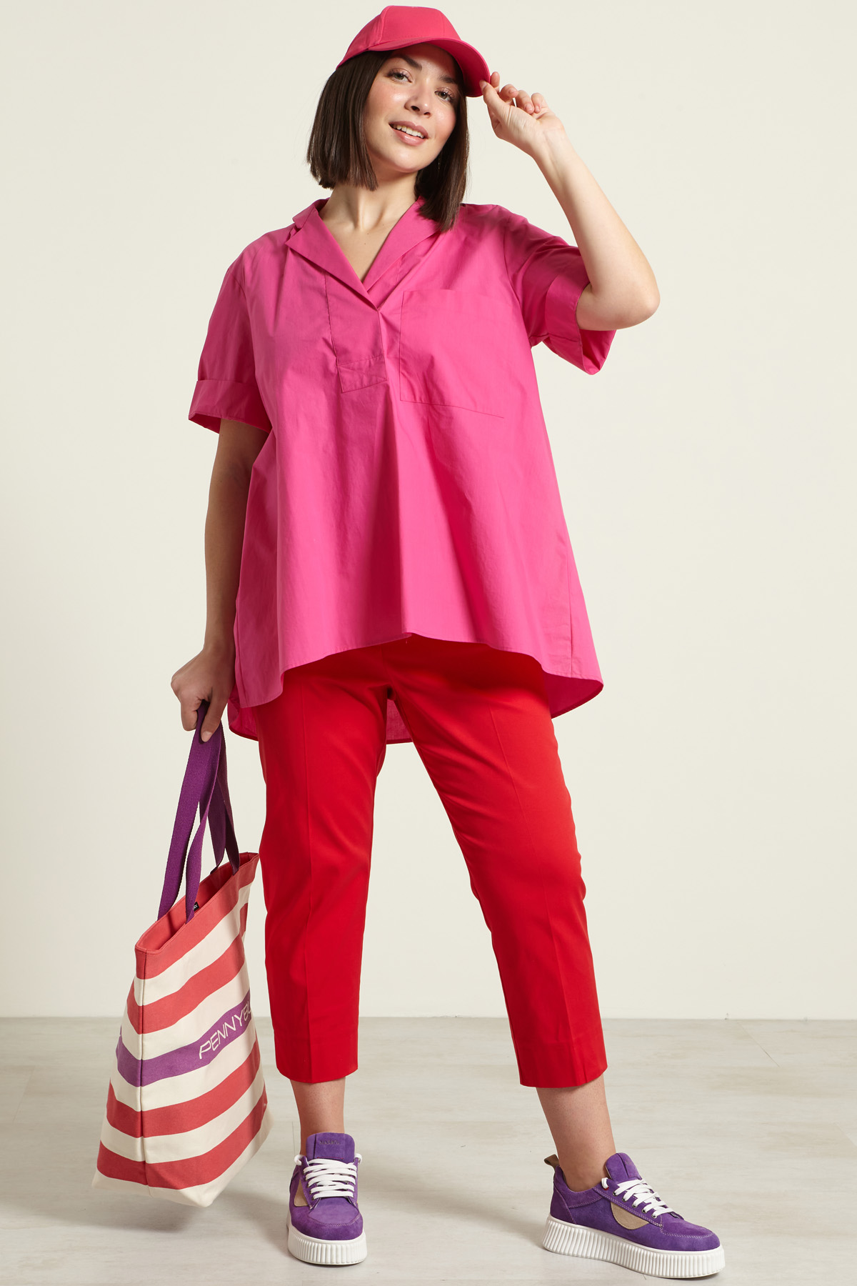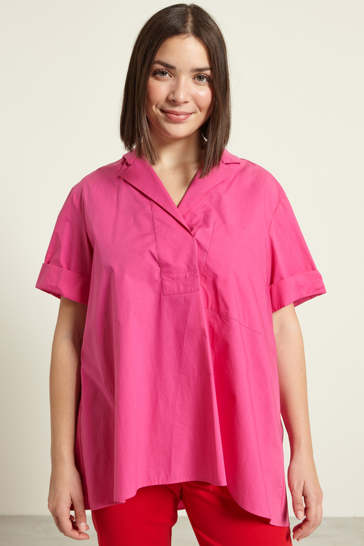 Casacca dalla linea svasata realizzata in popeline di puro cotone, con collo a rever, maniche corte, taschino applicato al petto, carrè con contropiego nel retro.