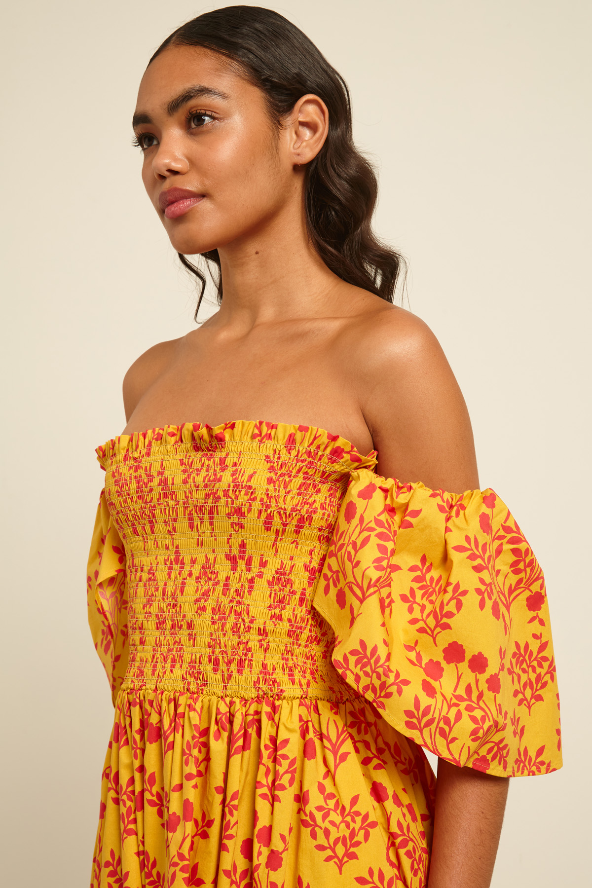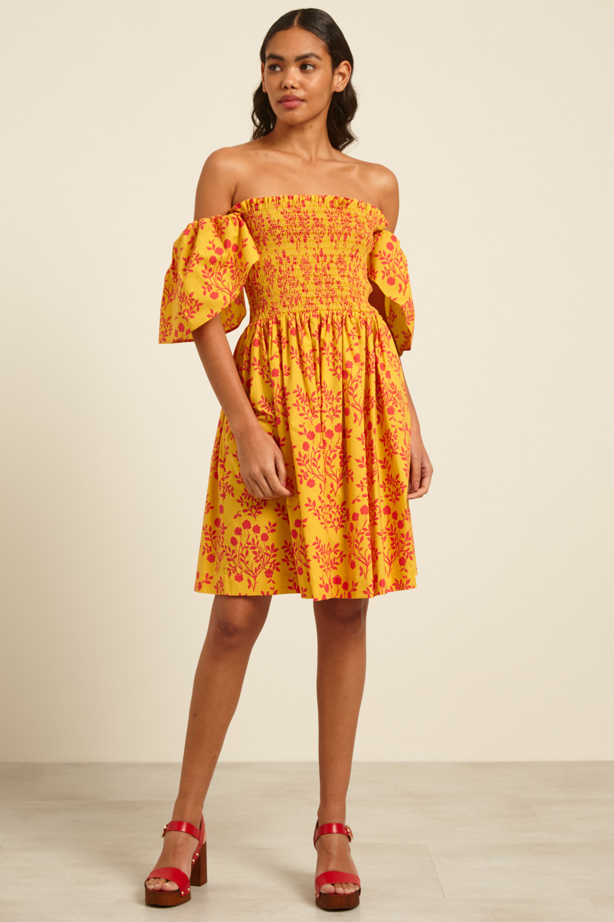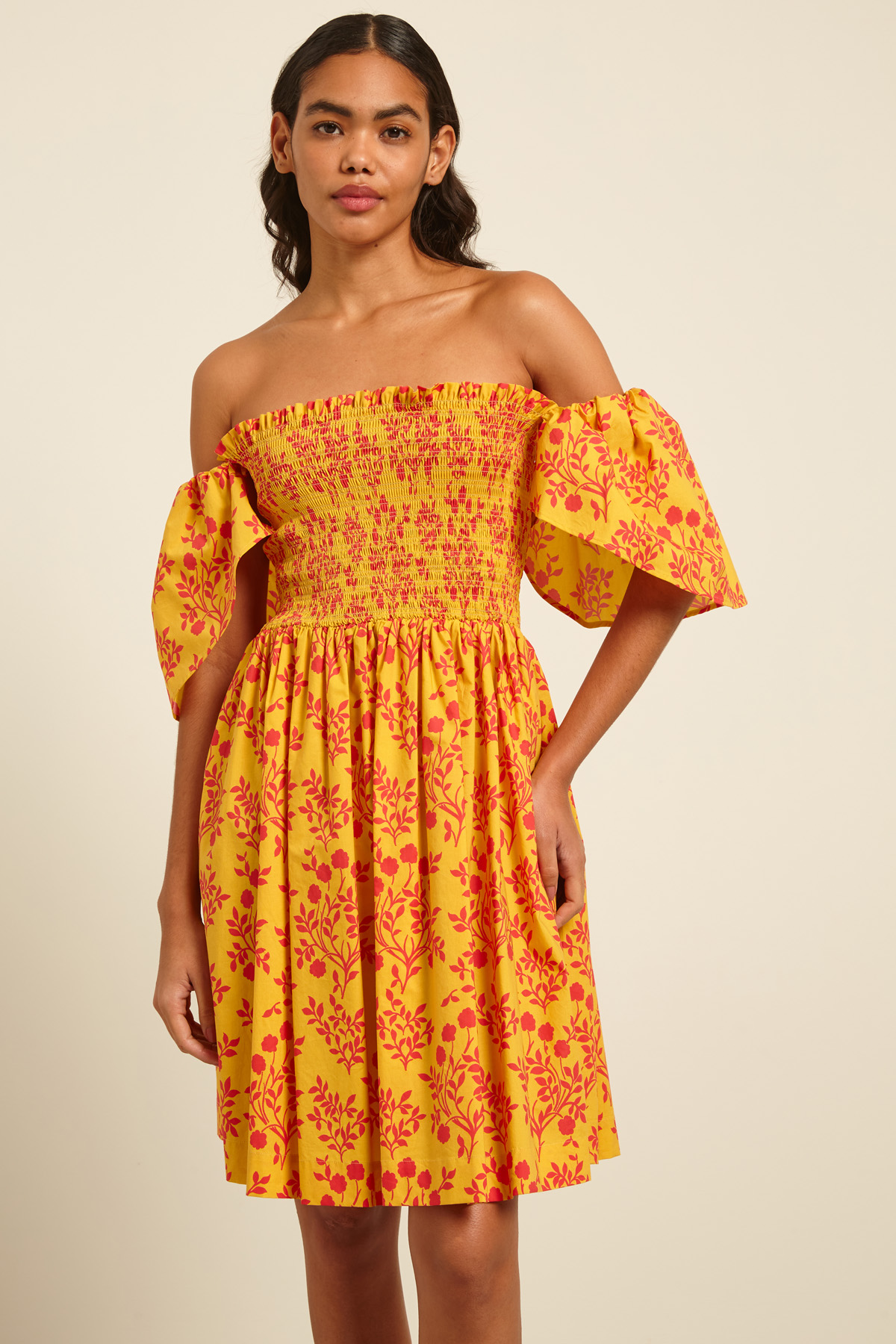 Abito corto dalla linea svasata realizzato in popeline di puro cotone stampato, con scollo ampio squadrato, maniche corte a fazzoletto, arricciatura elastica sul corpino e tasche laterali inserite in cucitura.