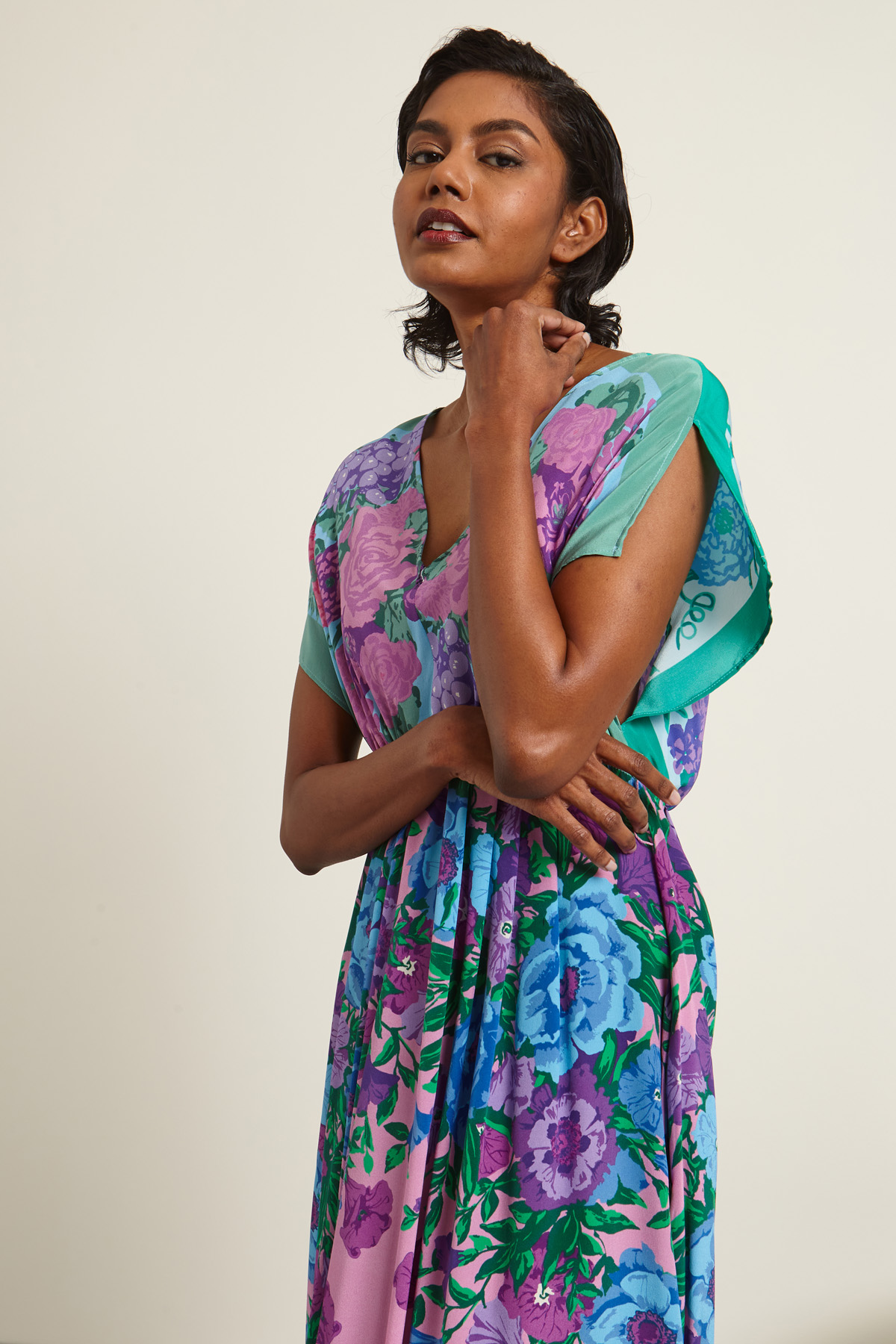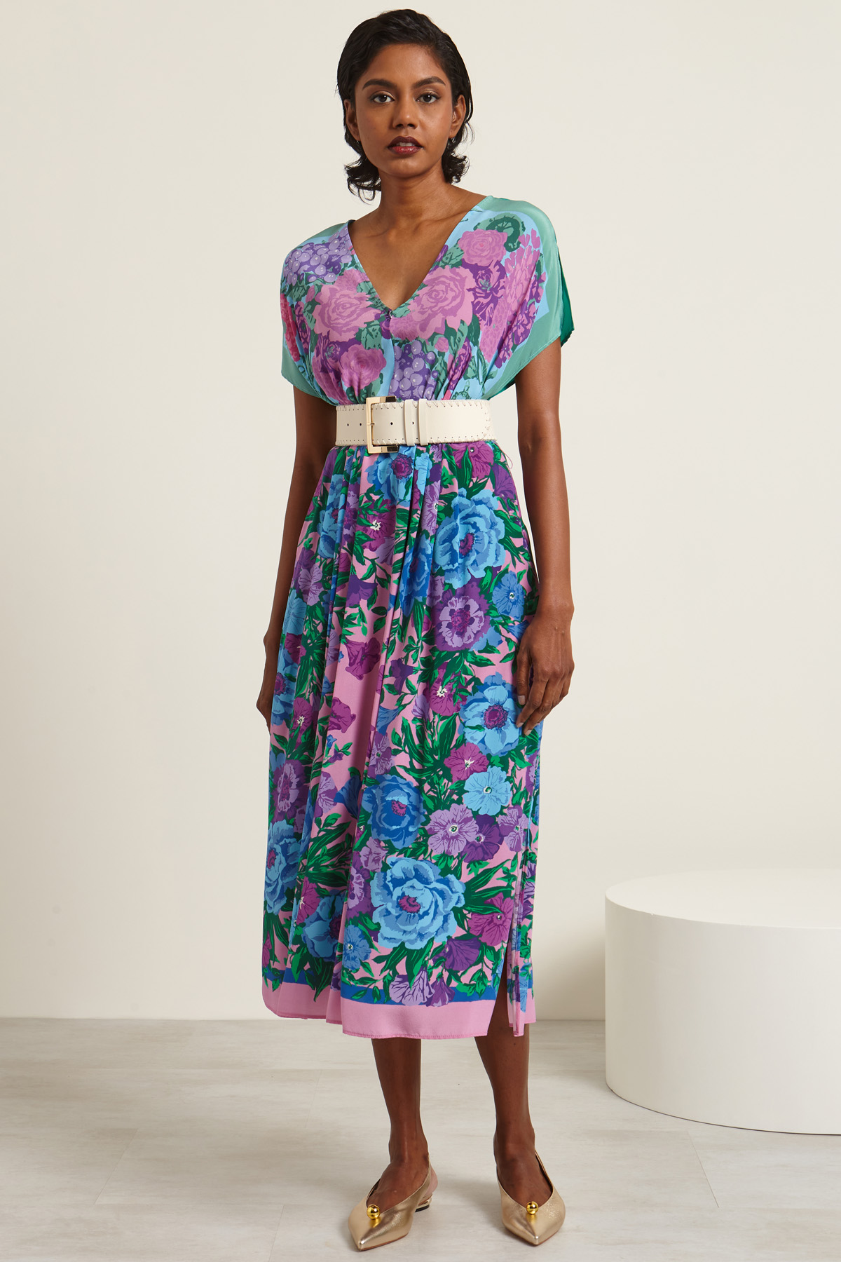 Abito dalla linea svasata realizzato in crêpe de chine di pura seta stampata con scollo a V, maniche corte a kimono e spacco, tasche inserite in cucitura e spacchi laterali. Allacciatura tramite zip nascosta nel retro e cintura coordinata. Sfoderato.