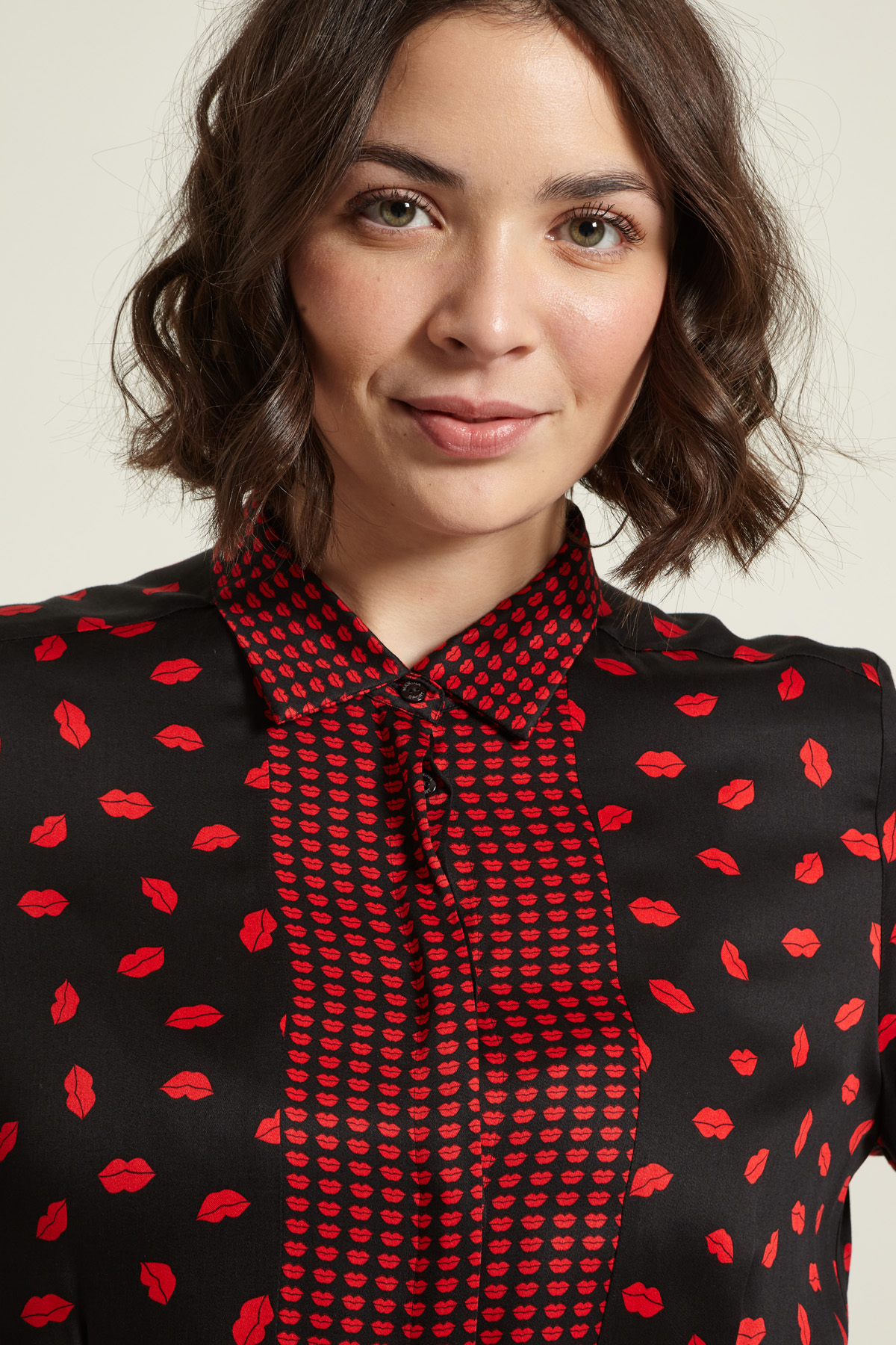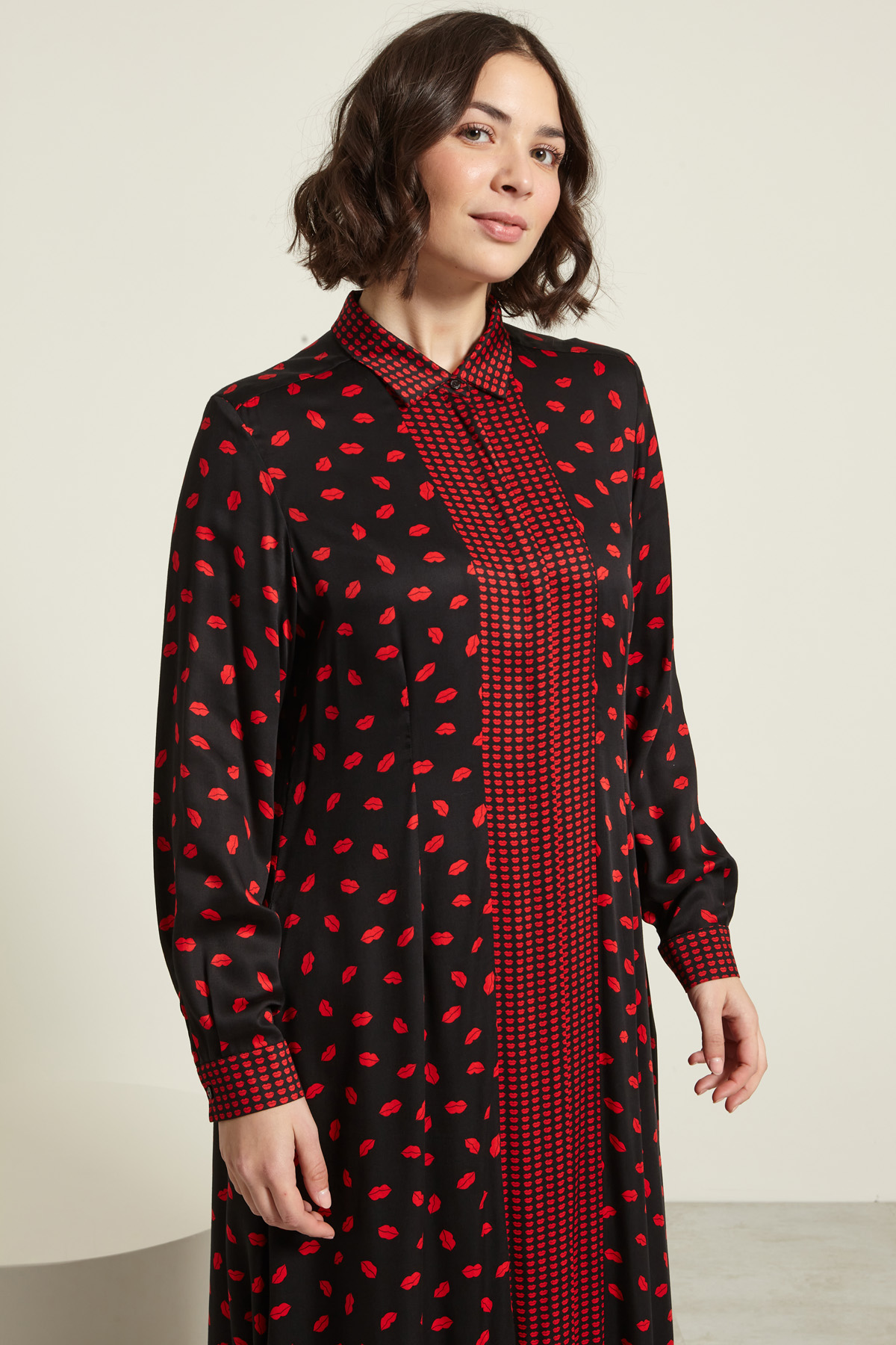 Abito lungo chemisier dalla linea fluida realizzato in raso di pura viscosa stampata, con colletto classico, maniche lunghe con polsino e bottone, tasche laterali inserite in cucitura. Allacciatura nascosta tramite bottoni a tutta lunghezza.