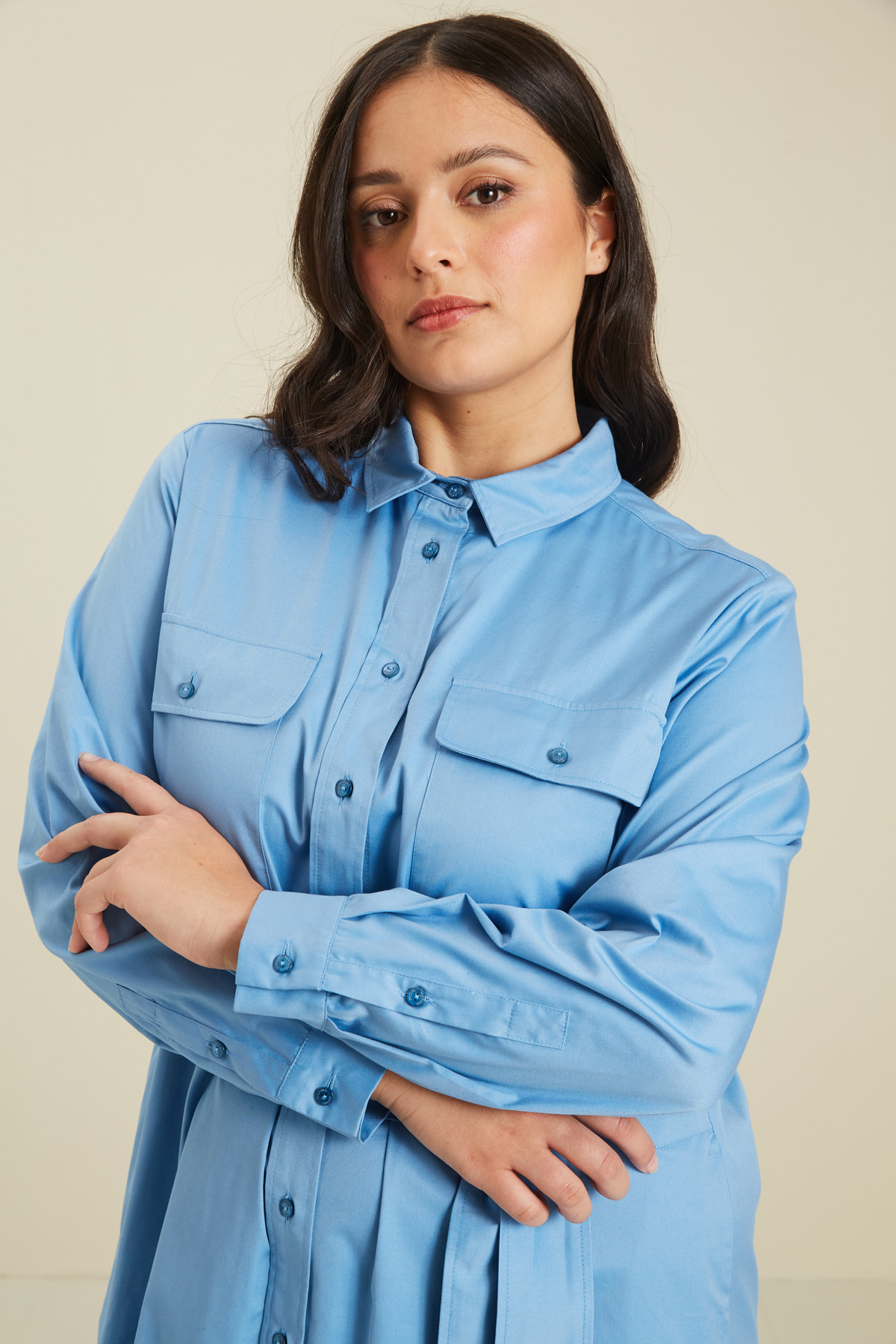 Abito chemisier dalla linea leggermente svasata realizzato in gabardina leggera di cotone, con colletto a camicia, maniche lunghe con polsino e bottone, tasche inserite in cucitura e spacchi laterali al fondo. Chiusura a bottoni. Capo dotato di cintura coordinata.