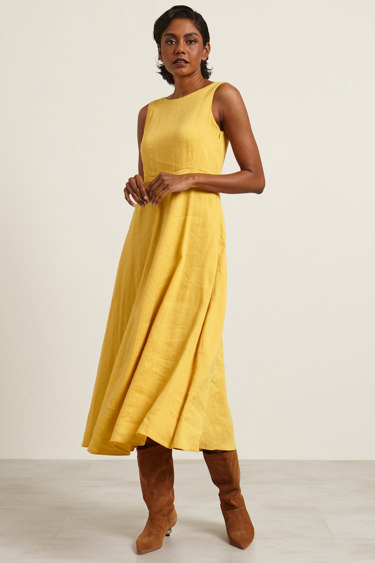 Abito smanicato dalla linea svasata realizzato in tela di misto lino e viscosa stretch, con scollo a barchetta davanti e profondo nel retro, taglio in vita e tasche inserite in cucitura. Allacciatura tramite zip invisibile sul fianco. Capo foderato.