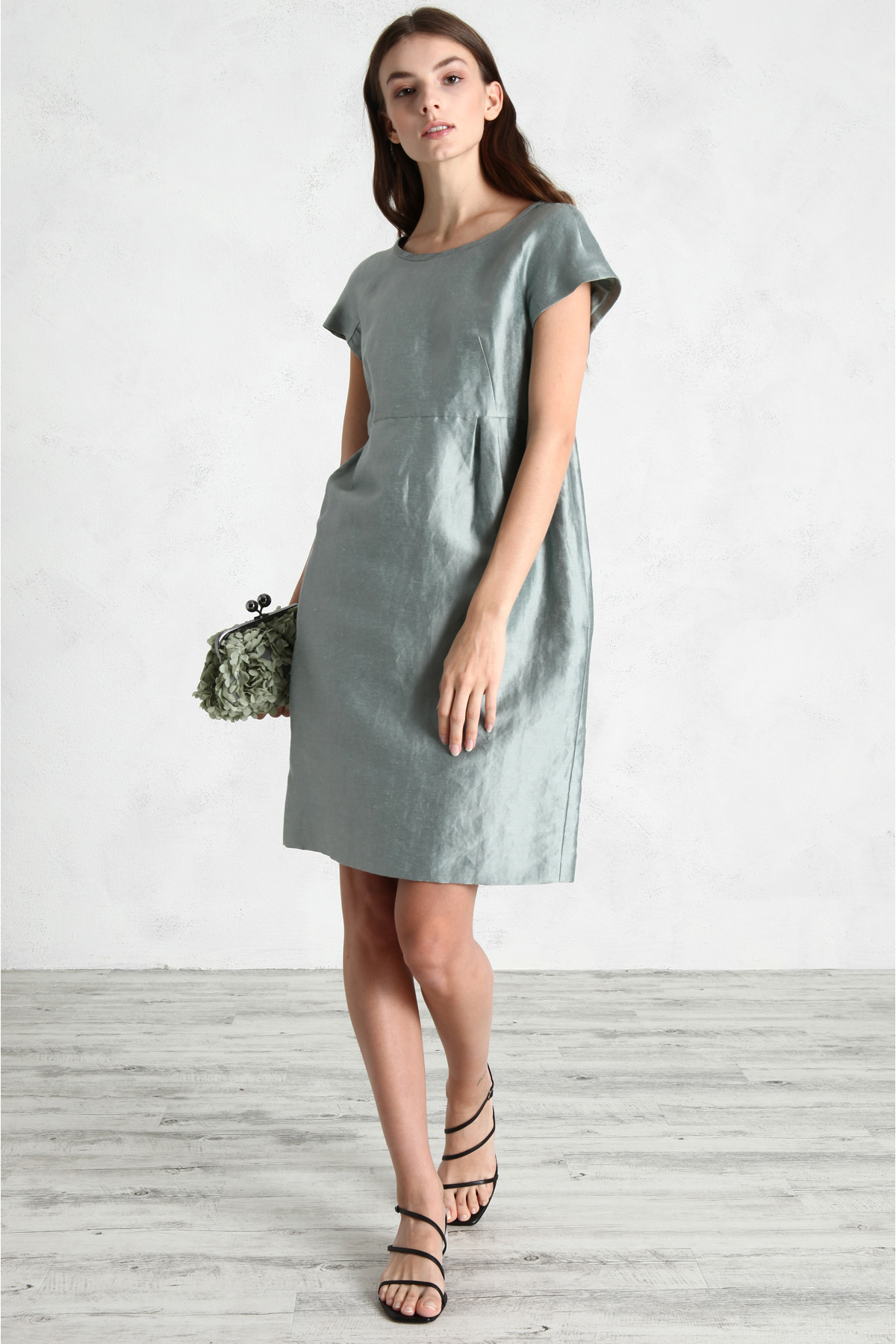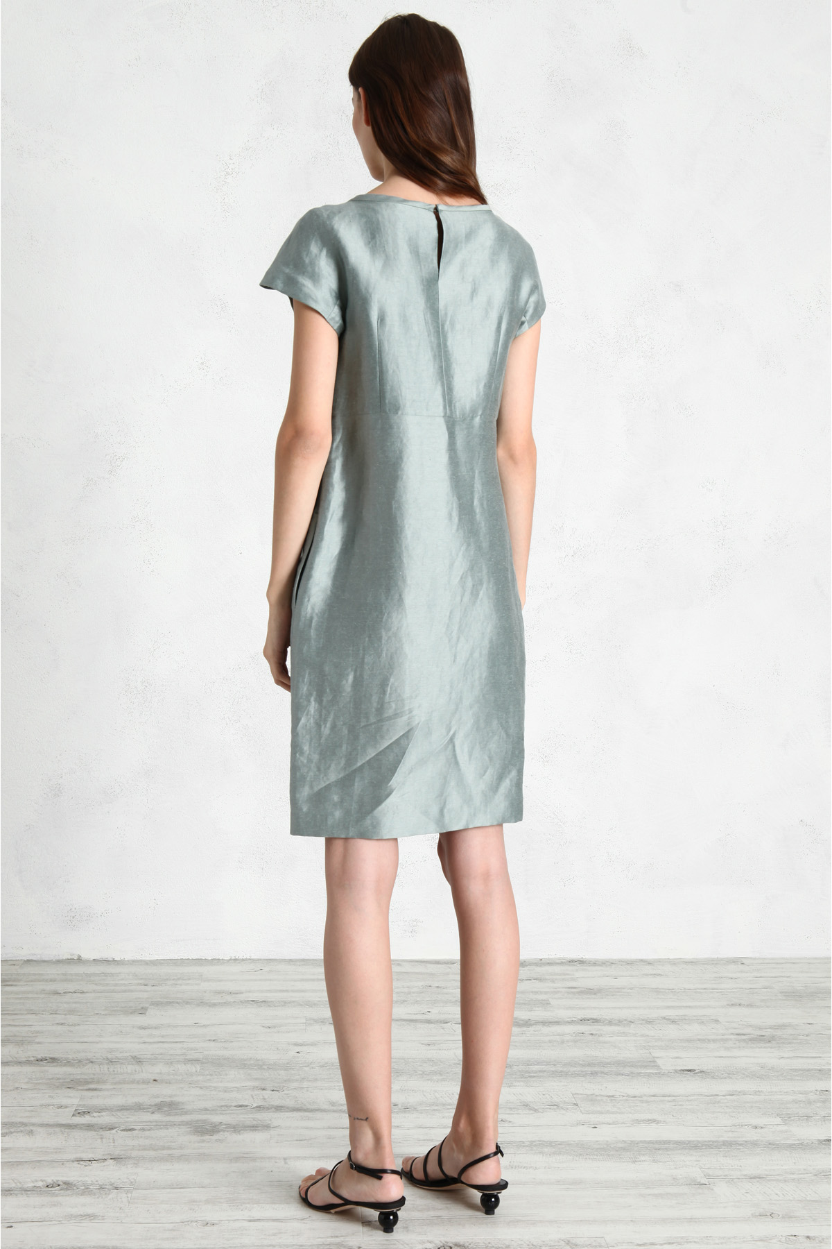 Abito dalla linea leggermente sfiancata realizzato in raso di seta e lino, con scollo rotondo, maniche corte a kimono, taglio in vita con pieghe e tasche inserite nei fianchi. Allacciatura con zip invisibile sul fianco.