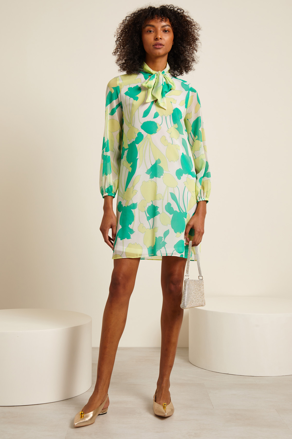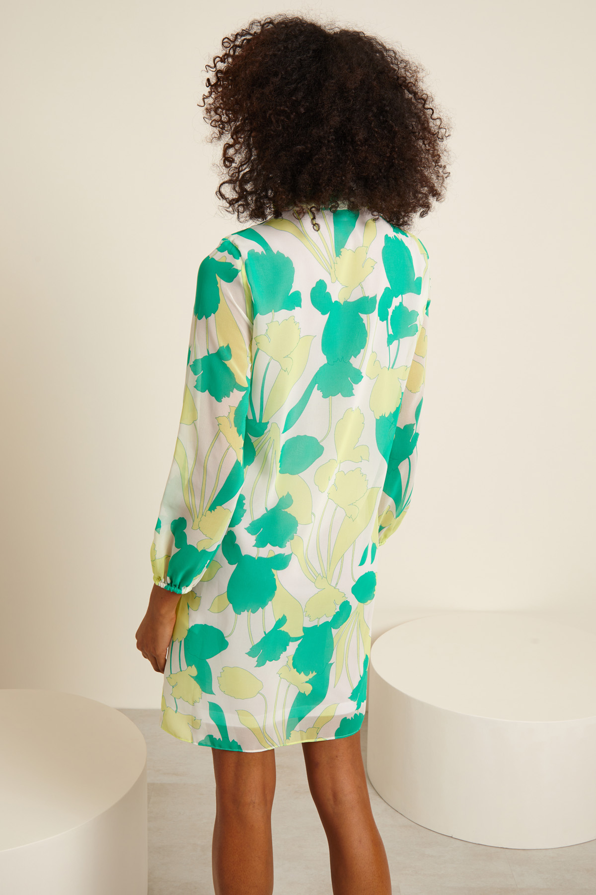 Abito dalla linea dritta realizzato in georgette stampato con collo a foulard e apertura a V e maniche lunghe con inserto elastico al polso.